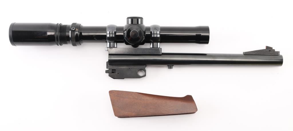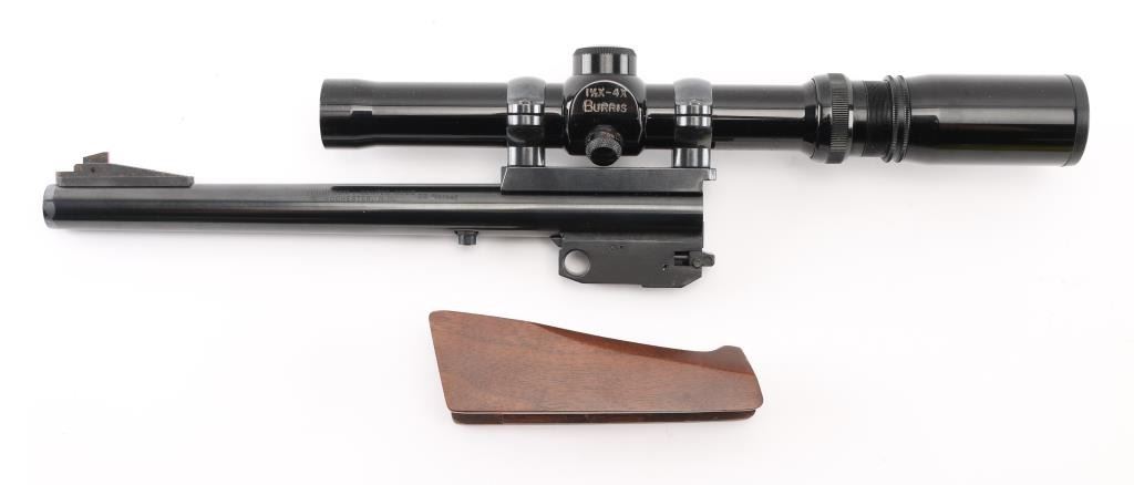 10" round/blue contender barrel chambered in .22 Hornet. Serrated ramp front sight, mounted with a Burris 1 1/2x-4x scope on Leupold base/rings, clear optics. Comes with the smooth walnut forearm, needs screw. Bore is excellent, there is some surface rust on the front sight., some finish loss on the left muzzle.