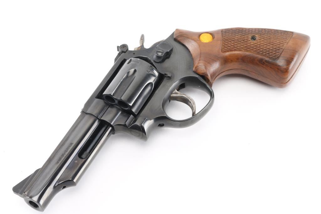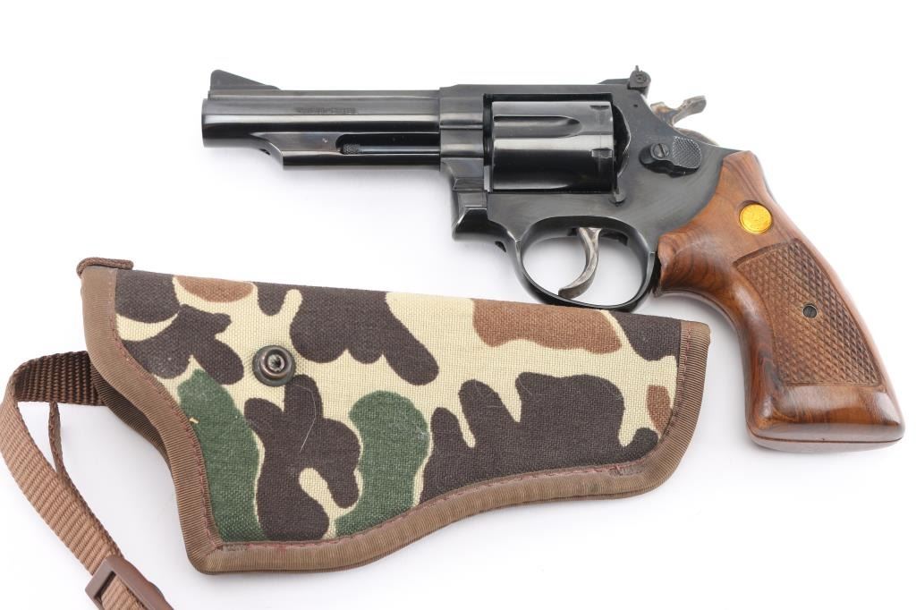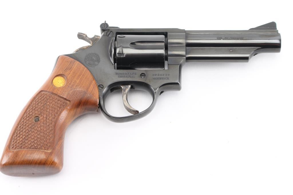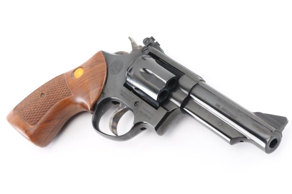 Brazilian made six-shot double action revolver chambered in .357 Magnum. Features a blued finish, 4" barrel with solid top rib, ramp front sight, adjustable rear window sight, fluted cylinder, case hardened wide serrated trigger and hammer with knurled hammer spur. factory checkered wood grips with Taurus monograms. Locks up tight. Metal finish, bore and grips all look great with very little signs of use, just a faint drag line on the cylinder. Comes in a camo nylon snap holster. NRA Condition-Very Good. Modern Firearm.
