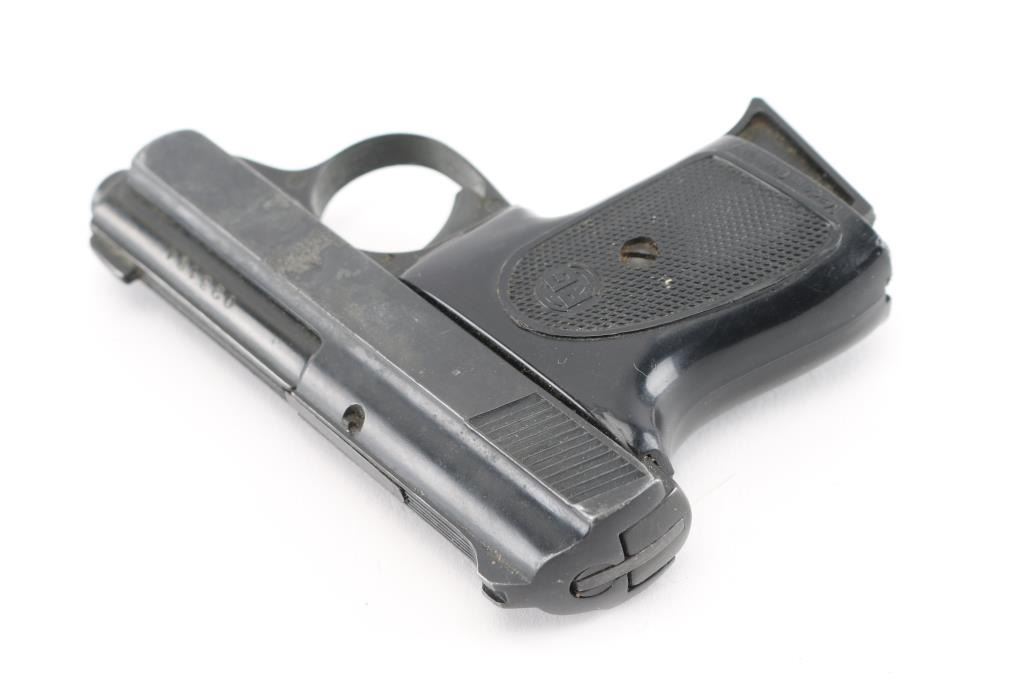 American made striker fired semi-automatic pocket pistol chambered in .25 Auto, manufactured circa 1968-1986. Features a black finish, 2.5" fixed barrel, fixed sights, smooth trigger, manual safety on the left side of the frame, heel magazine release, 6 round magazine with finger rest floorplate, and factory two-piece checkered black plastic grips. Pistol exhibits the majority of it's black finish showing edge wear, scratches and scuffs. Action is sound, the bore shows scattered light pitting and the plastic grips are very good. Comes in a black nylon snap holster. Condition is NRA Fair to Good. Modern Firearm.