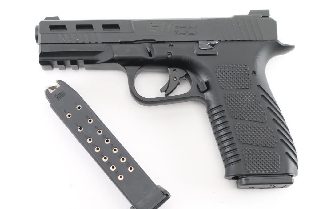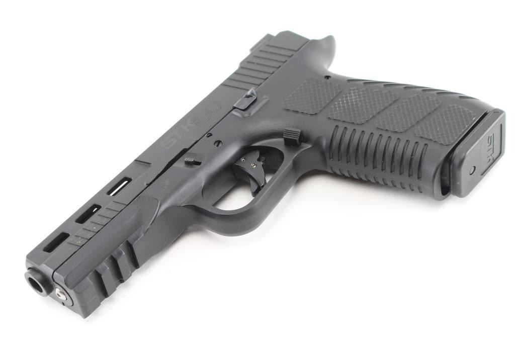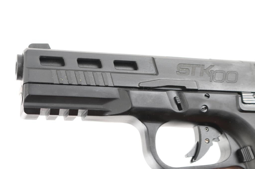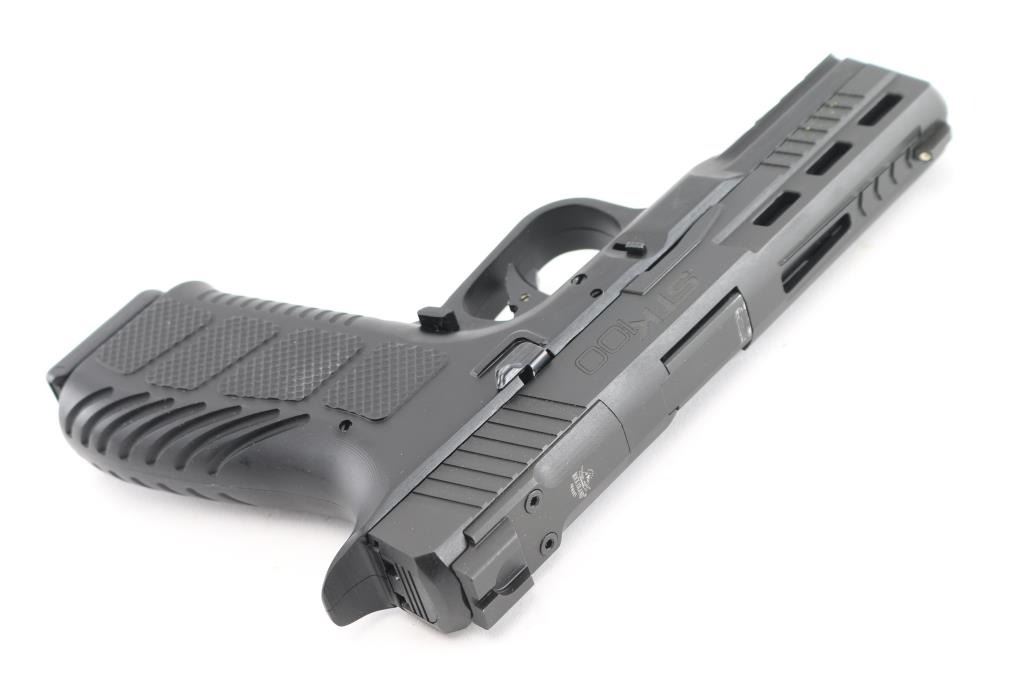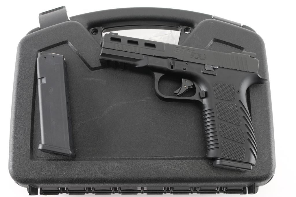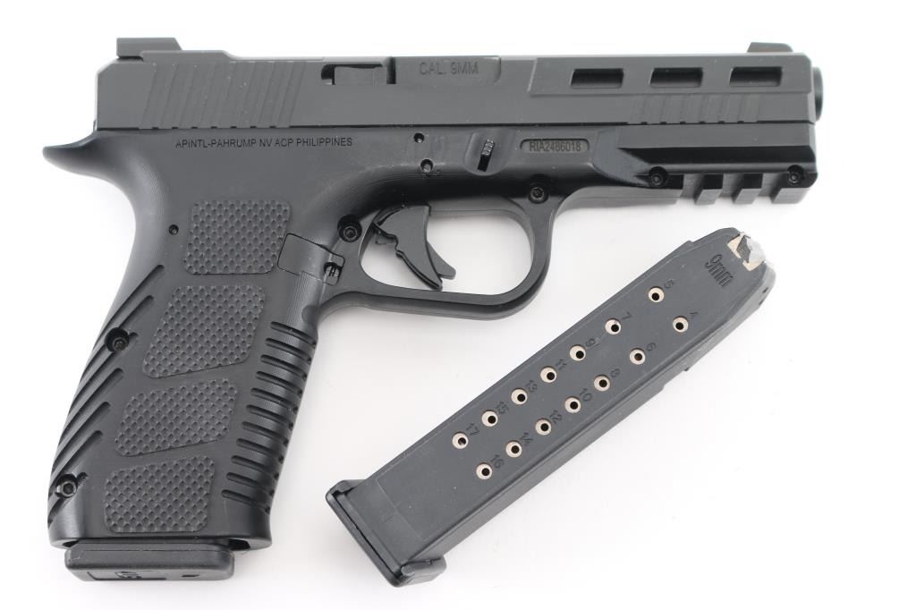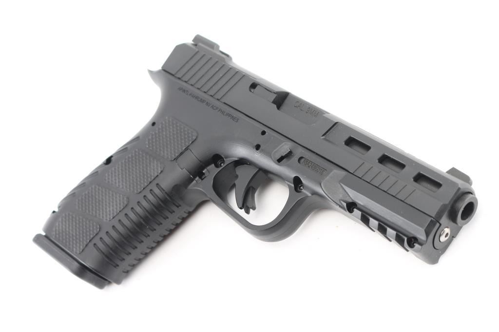 Striker-fired semiautomatic pistol made in the Philippines, imported by APINTL, Pahrump NV. Features matte black finish, aluminum frame with textured grip front and back, 4.5" barrel, slide has front and back serrations and front cut-outs w/white dot front sight and black dovetail rear sight, MOS ready. Includes (2) 17 round two magazines, factory hard black plastic case with manual and lock. Condition is NRA Excellent *** Modern Firearm ***