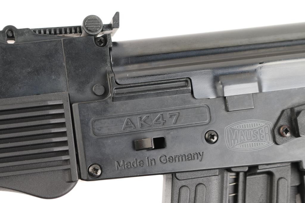 Made in Germany by GSG and imported by Blue Line Branded with Mauser logo. Solutions of Blaine, Wash. AK-47 style semi-automatic rifle chambered in .22 LR. 17.7" barrel, hooded front sight with adjustable rear sight, polymer stock and forearm. Comes with (1) 24 round polymer magazine, tools and manual. Condition is NRA Excellent. Modern Firearm.