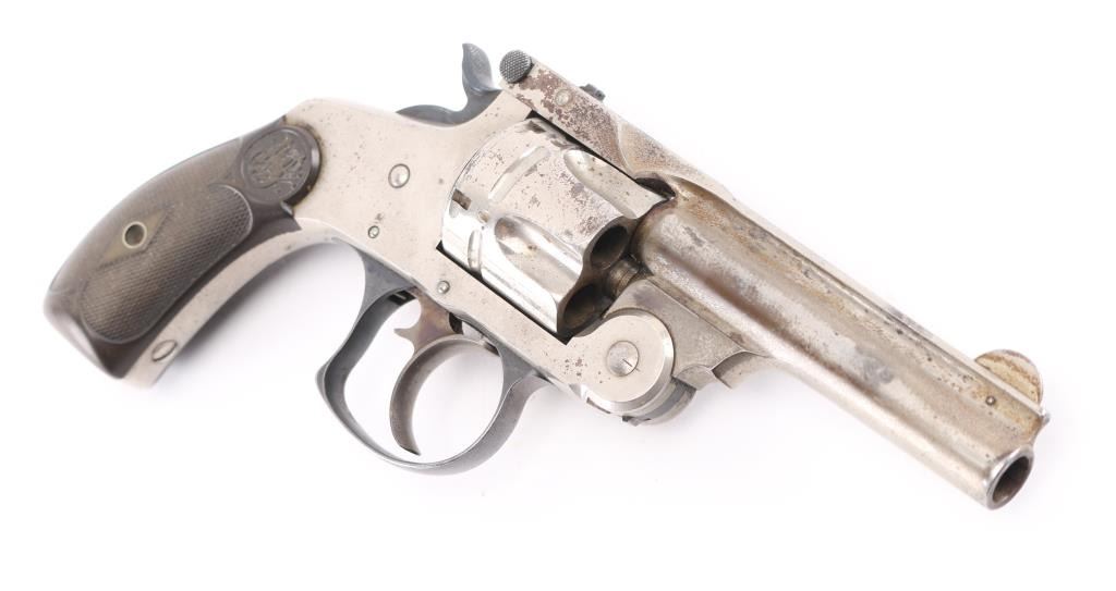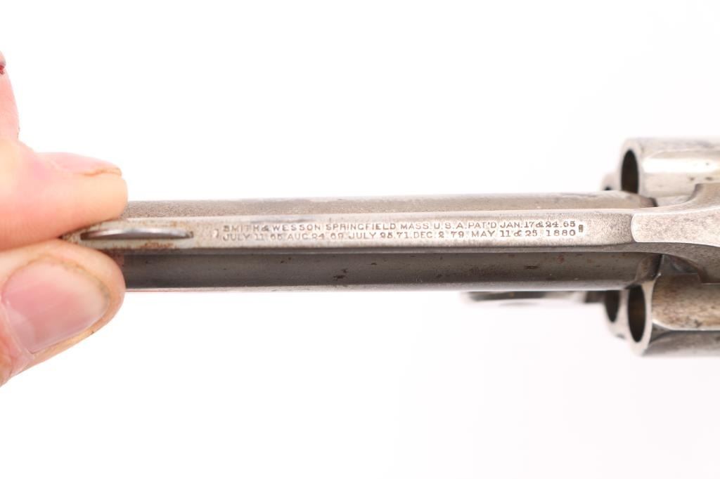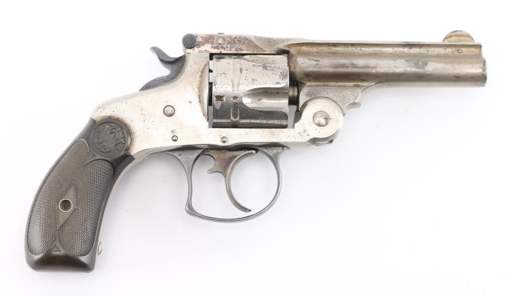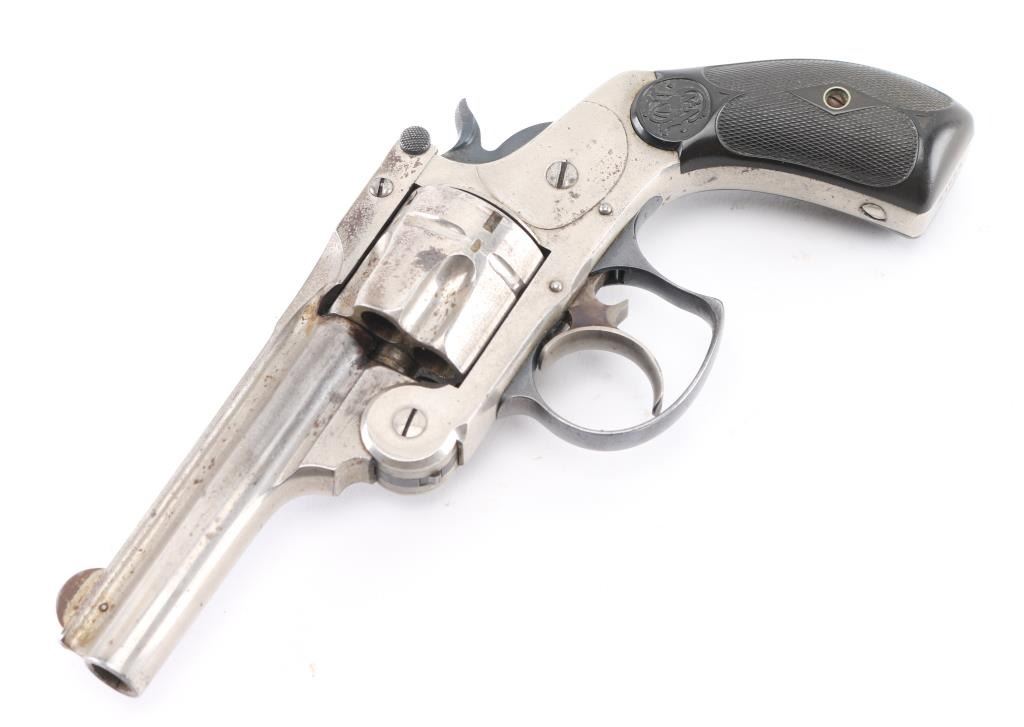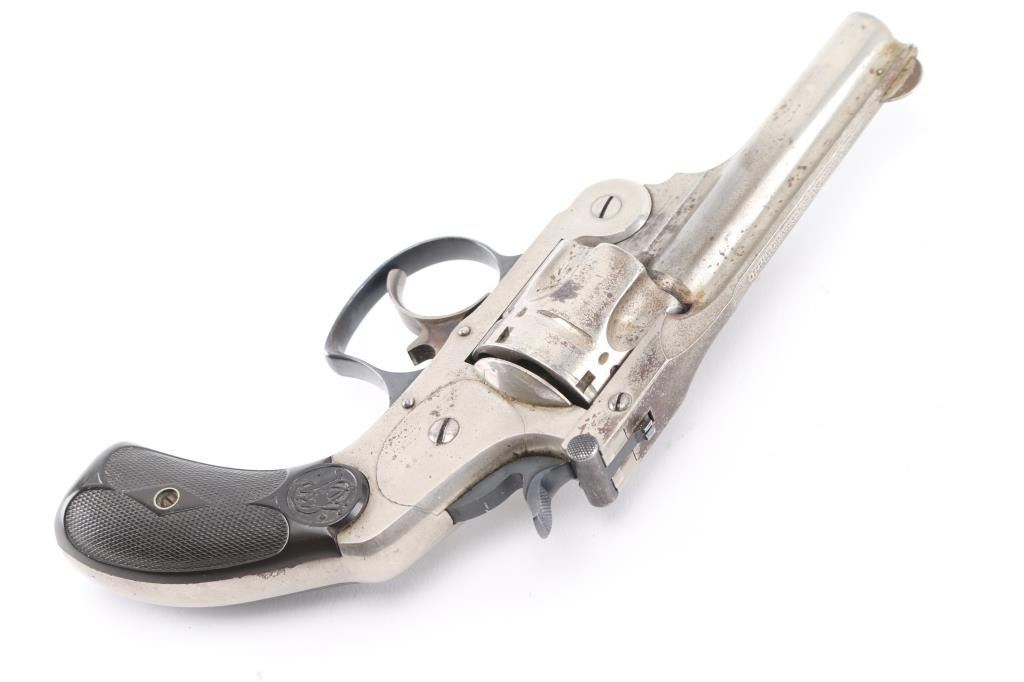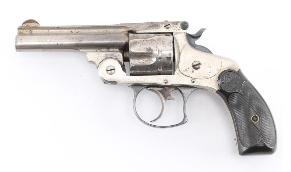 SN: 64076 ‘.38 Double Action 2nd Model’ Antique double action top-break revolver chambered in .38 Smith & Wesson, manufactured circa 1880-1884. Features a nickel plated finish, 3 1/4" ribbed barrel, pinned round blade front sight, 'v' notch rear sight cut into the top of the "T" shaped barrel latch, smooth crescent trigger, re-curve trigger guard, knurled wide hammer spur, fluted five-shot cylinder with two sets of stops,black hard rubber grips on round butt frame. Matching serial numbers are found on the frame, cylinder and barrel latch. Revolver retains approximately 50% of its bright nickel plated refinish showing spots of rust, oxidation and pitting. Action is smooth with good lock-up, the bore and chambers are good and the plastic grips are fine. Condition is NRA Good. ***Antique Firearm***