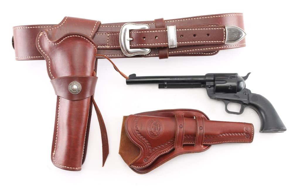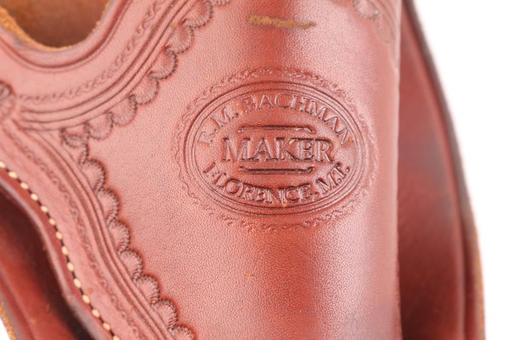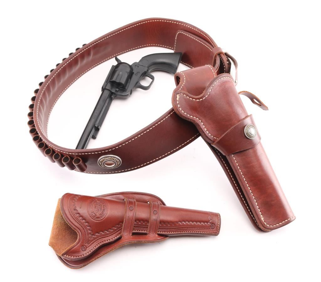 High quality holsters/belt for SAA's with 7 1/2" barrels. 1) Old West Reproductions brown leather double loop holster with border tooling. Marked "R.M. Bachman Maker Florence MT." Has a plastic model of a SAA in it to keep the form. Excellent condition. 2) Unmarked holster belt rig, single loop holster with concho, belt is about 38-42 size, with twenty .45 Colt cartridge loops with a concho on each side of the loops. Excellent condition.