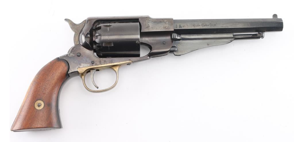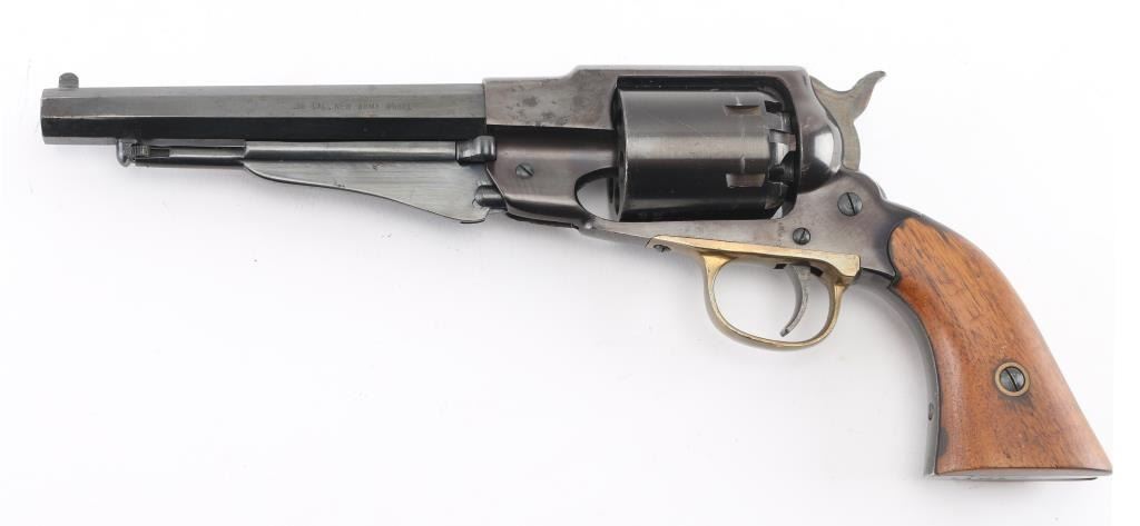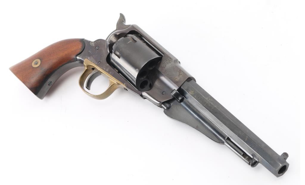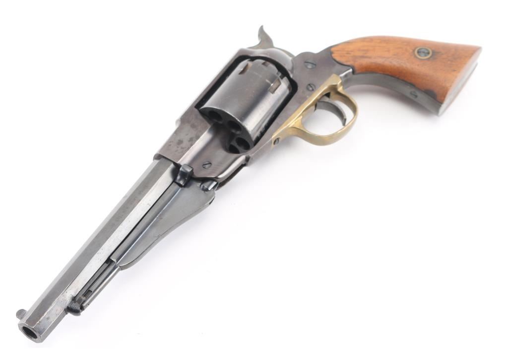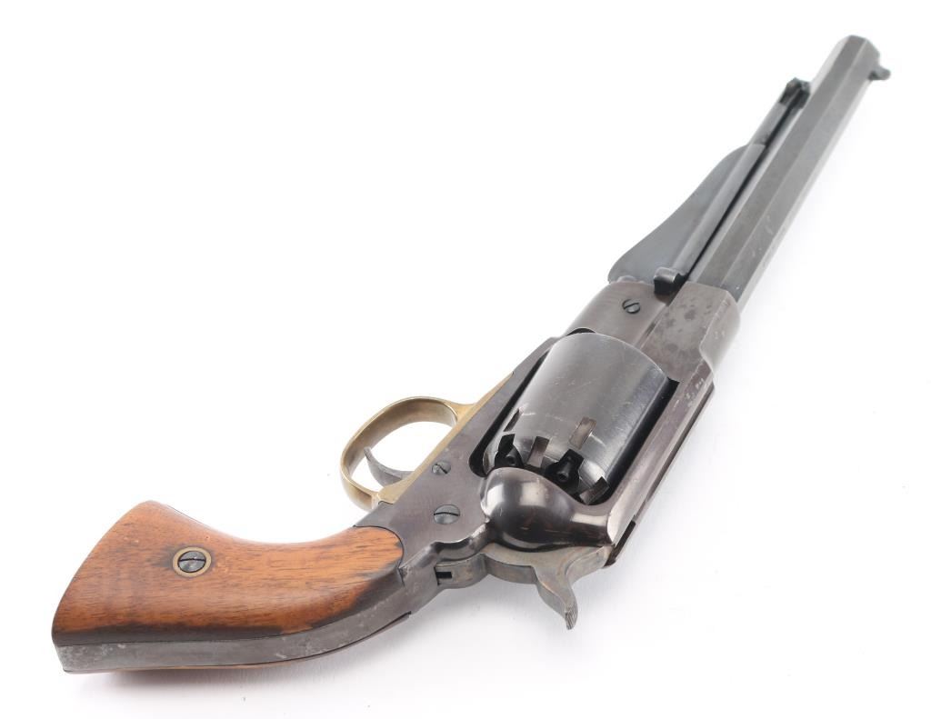 Replica black powder percussion revolver, six shot, 6 1/2" barrel. blade front sight, integral channel rear sight, serrated hammer, smooth trigger, brass trigger guard, two-piece wood grips, black finish is worn. **NRA Fair** Antique Firearm