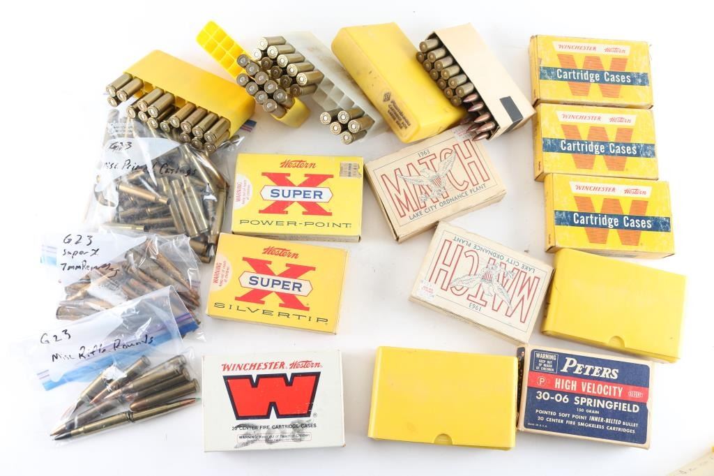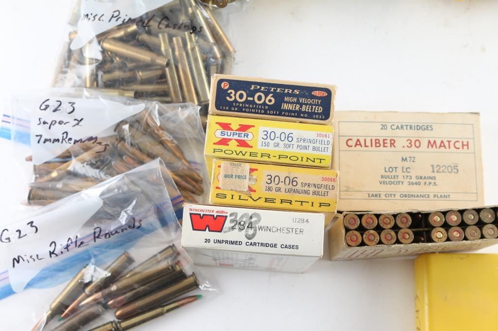 Reloaded ammunition (approximate counts): 30-06 Sprg - 133; .284 Win Super - 27; .243 Win - 104; .308 Norma Magnum Re - 40; 7mm Rem Mag - 18; .30 caliber - 40; .350 Win Mag - 47; .444 Marlin - 14; 30-30 Win - 8; .460 S&W Mag - 20; .220 Swift - 36; "LC 63 NM" - 10; Miscellaneous rounds - 9. Approximately 55 primed rifle casings.