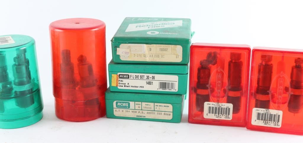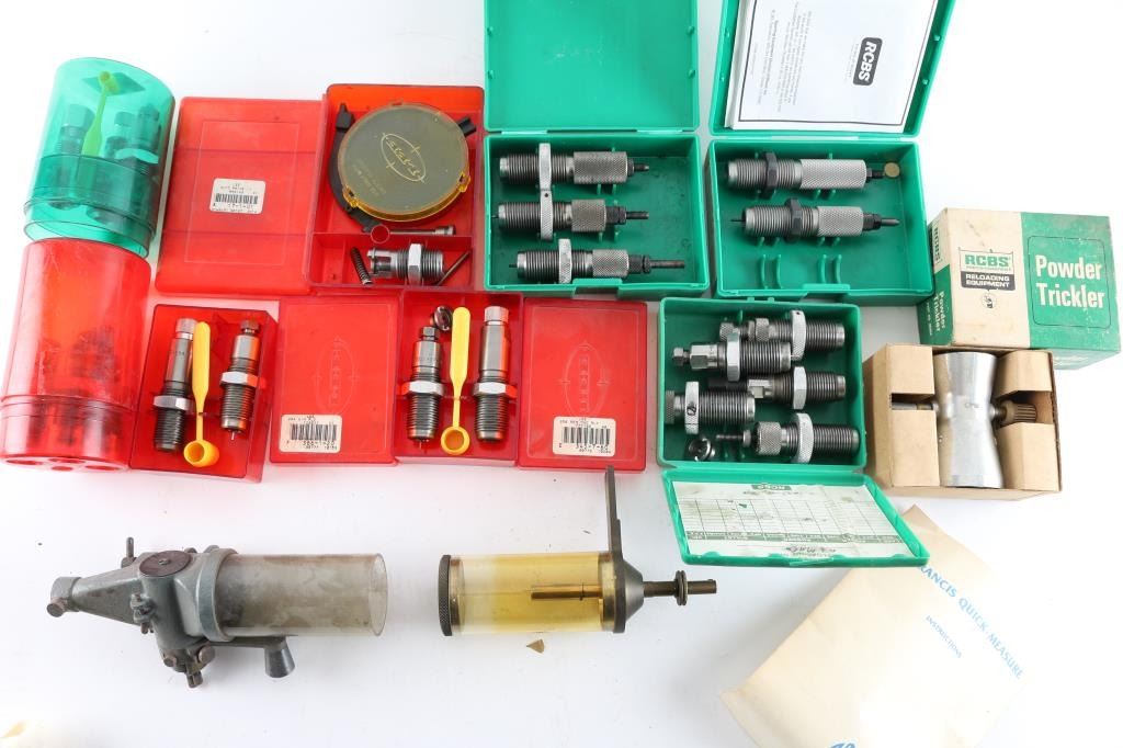 Lot includes 30-06 Dies, .284 WIN, .41 MAGT, 44-40, .350 REM MAG, Quick measure, Powder Trickler and more.
