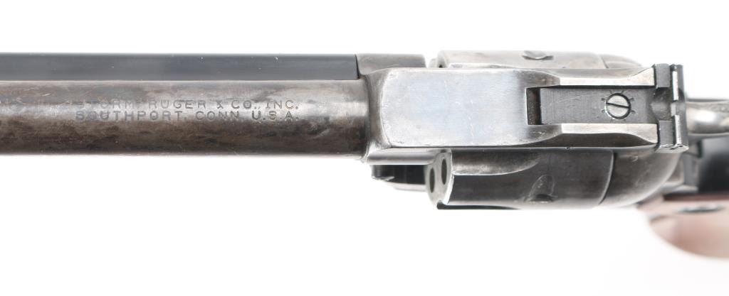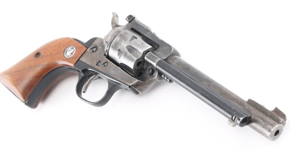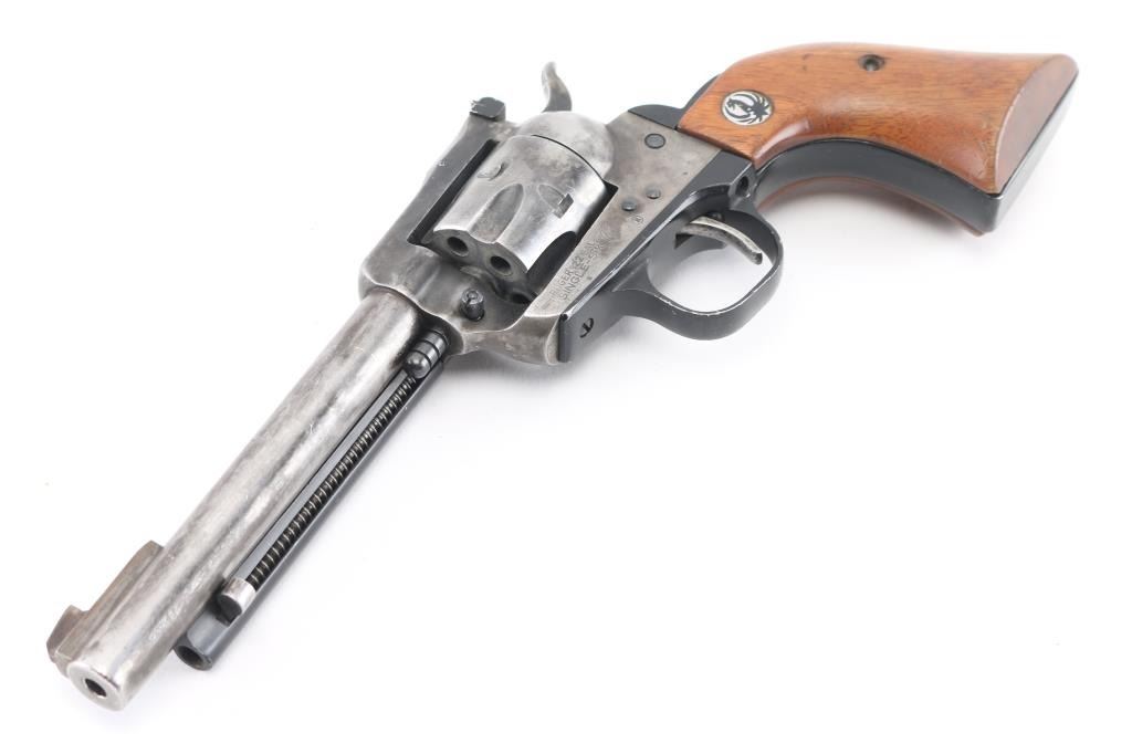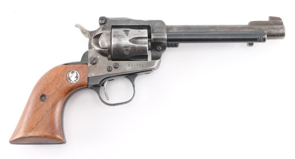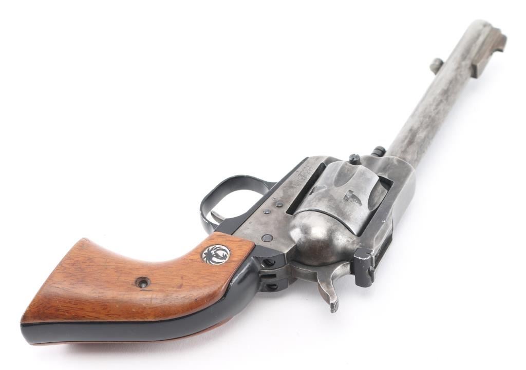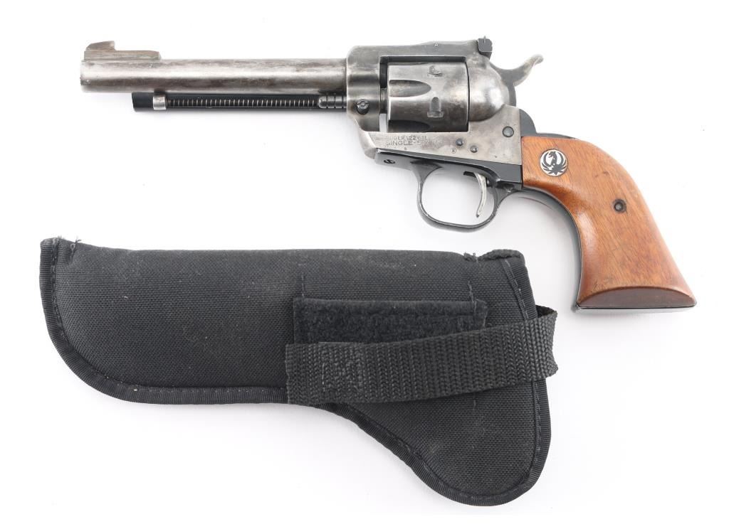 Single action revolver with 5 1/2" barrel, ramp front sight, notch rear sight adjustable for windage, serrated hammer spur, smooth trigger, wood Ruger grips, most of the finish is gone, scratches on cylinder. Includes black nylon holster. **NRA Poor** Modern Firearm