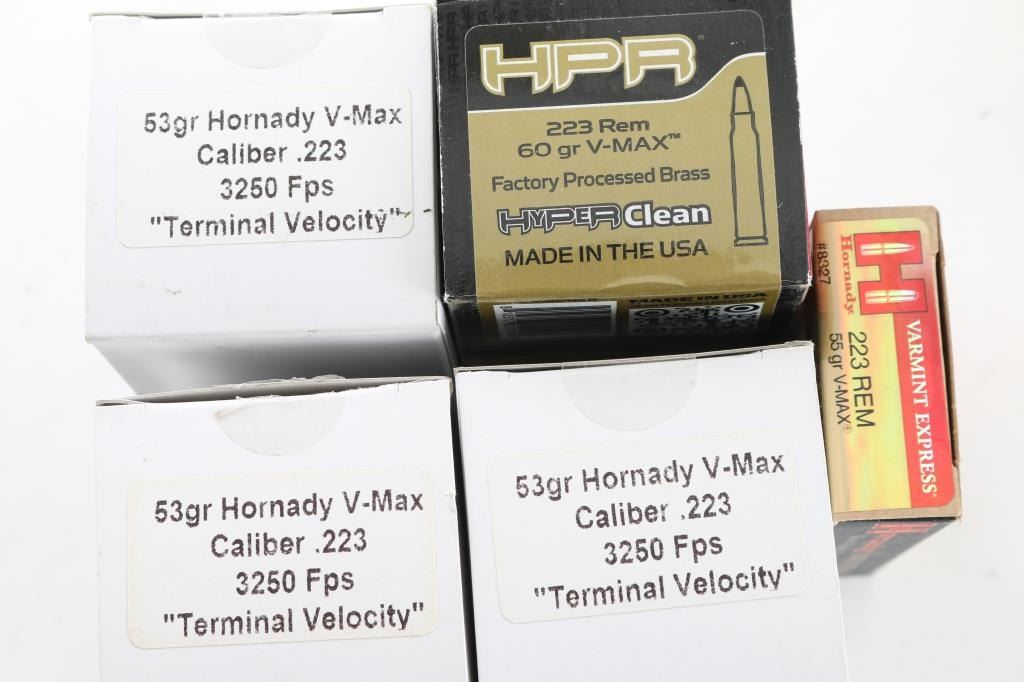 Counts are approximate. Hornady Varmint Express 55 gr V-Max - 20; HPR remanufactured HyperClean 60 gr V-Max - 50; Dead Zero Ammunition Terminal Velocity 53 gr V-Max - 150.