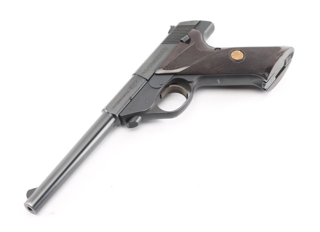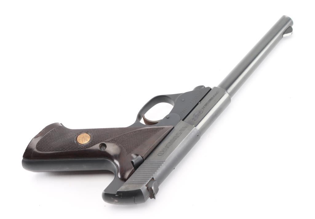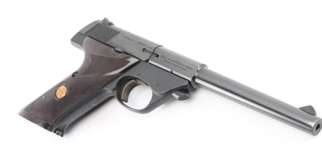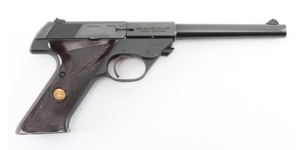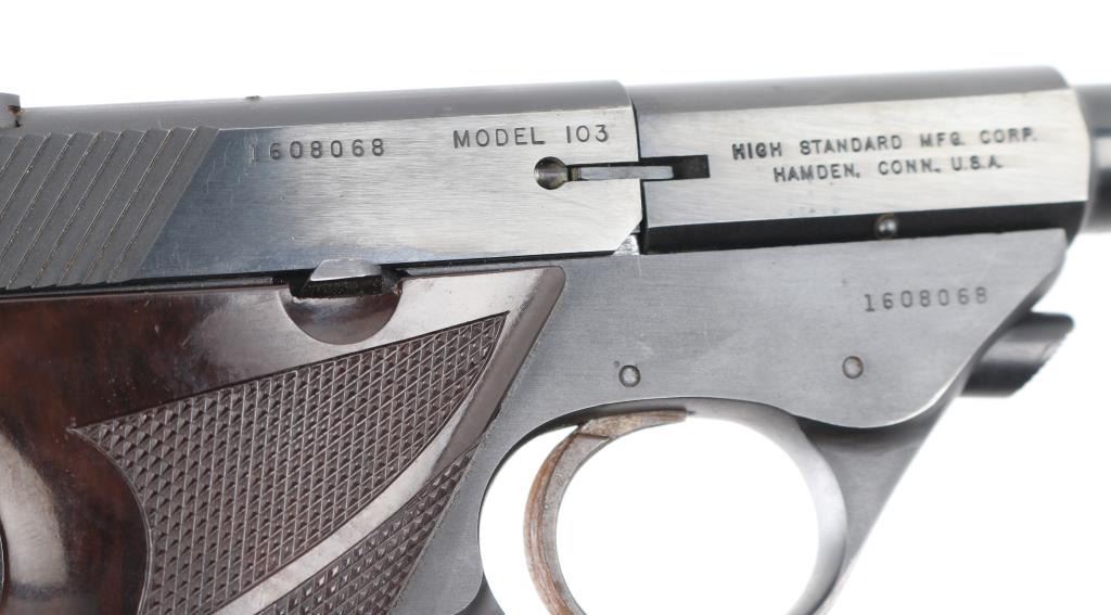 '103 Series' Single action semi-automatic target pistol chambered in .22 Long Rifle, manufactured circa 1969. Features a matte & polished blued finish, 6 3/4" barrel with push button release, serrated ramp front sight with white accent, dovetailed rear sight with square notch, serrated wide trigger, concealed hammer, thumb safety on the left side of the frame, slide catch on the right side of the frame, heel magazine release, factory 10 round magazine, steel frame and two-piece checkered faux wood synthetic grips with Hi-Standard medallions. Pistol exhibits approximately 98% of it's original finish showing minimal edge wear on front end of barrel and grip straps, small chip on the bottom left grip panel. Action is smooth, the bore is excellent Comes with (1) 10 round metal magazine. Condition is near NRA Excellent. ***Modern Firearm***