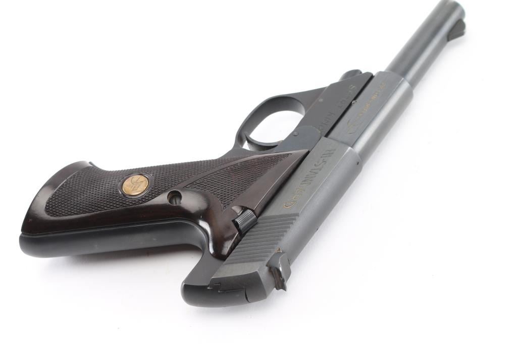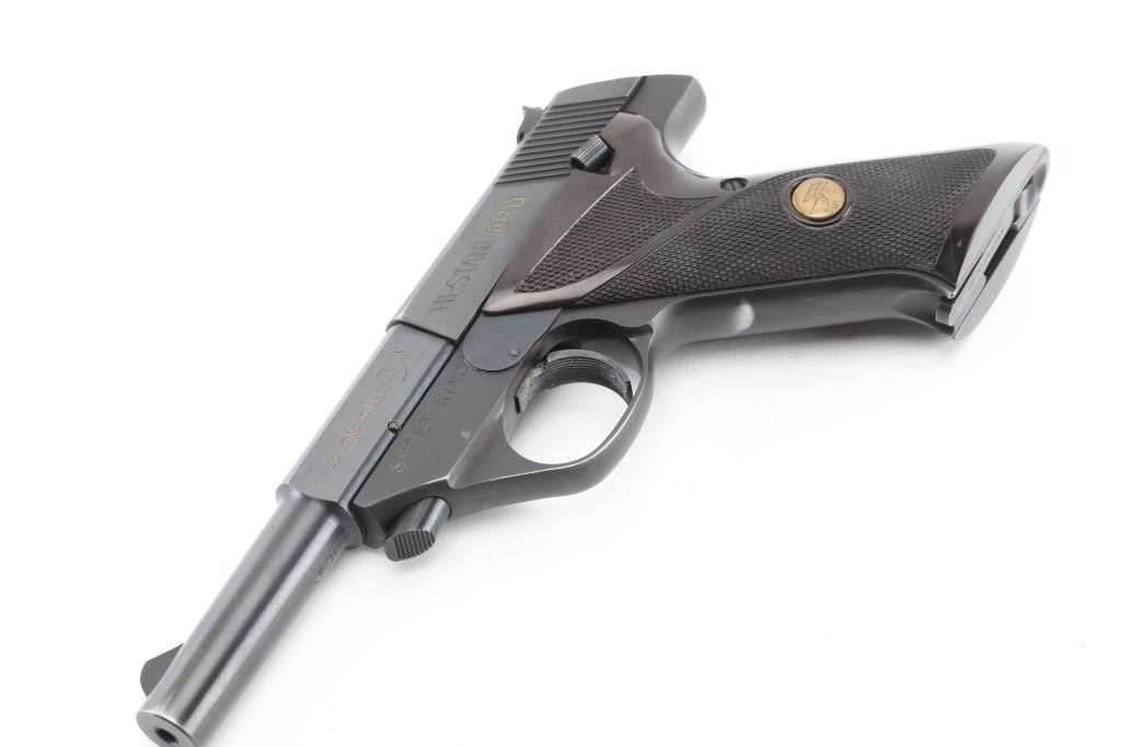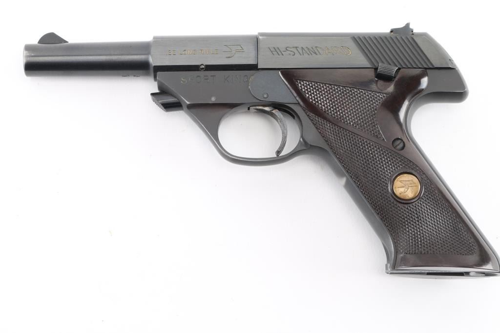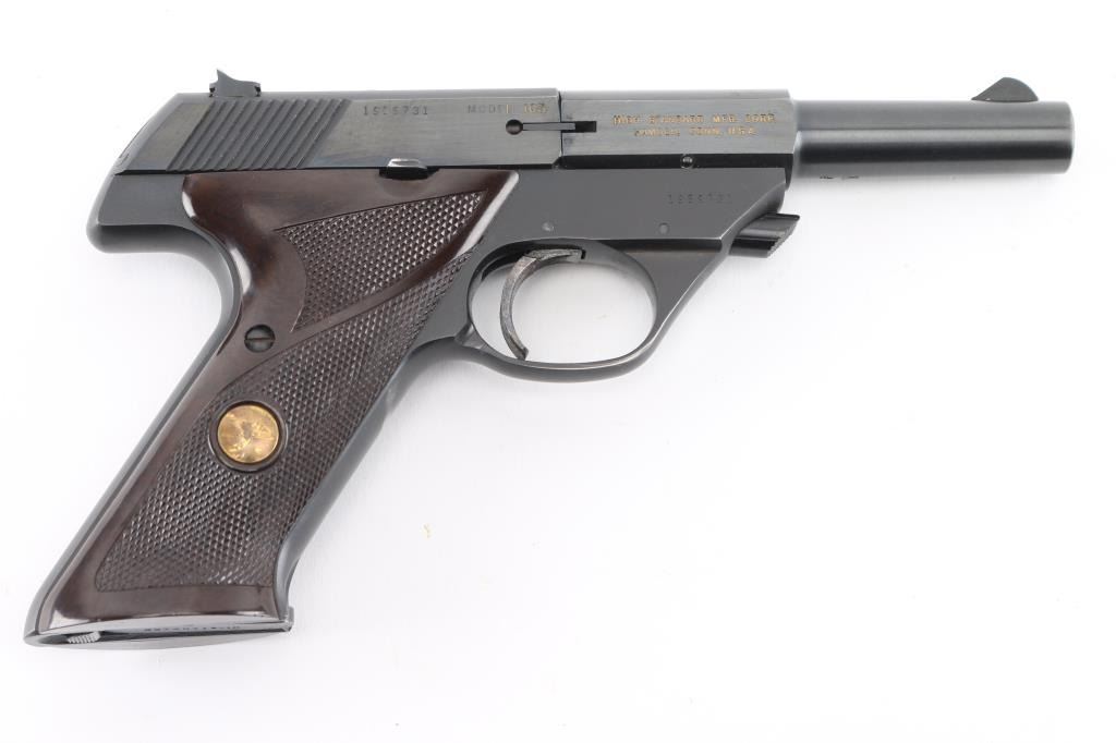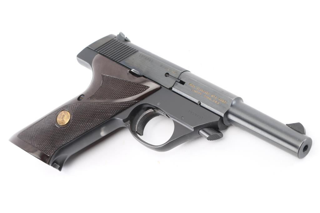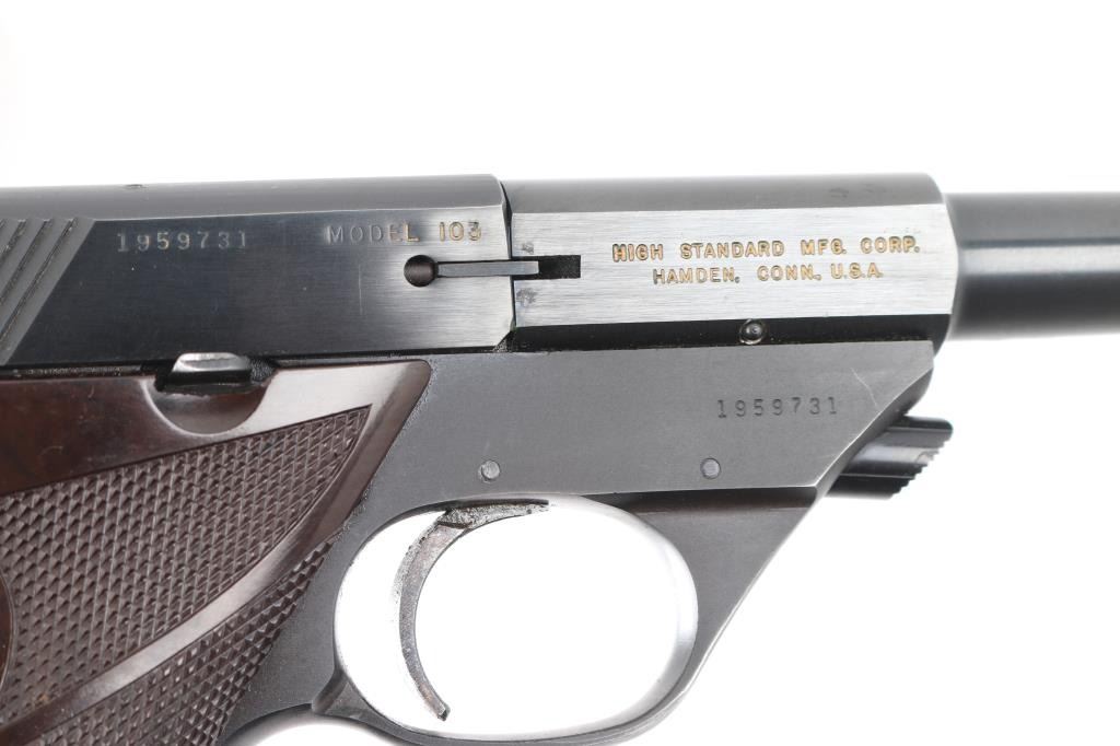 '103 Series' Single action semi-automatic target pistol chambered in .22 Long Rifle, manufactured circa 1967. Features a matte & polished blued finish, 4 1/2" barrel with serrated ramp front sight, dovetailed rear sight with square notch, serrated wide trigger, concealed hammer, thumb safety on the left side of the frame, slide catch on the right side of the frame, heel magazine release, factory 10 round magazine, steel frame and two-piece checkered faux wood synthetic grips with gold-colored Hi-Standard medallions. Includes (1) 10 round metal magazine. Pistol exhibits approximately 98% of it's original finish showing minimal edge wear. Action is smooth, the bore and grips are excellent. Condition is near NRA Excellent. ***Modern Firearm***
