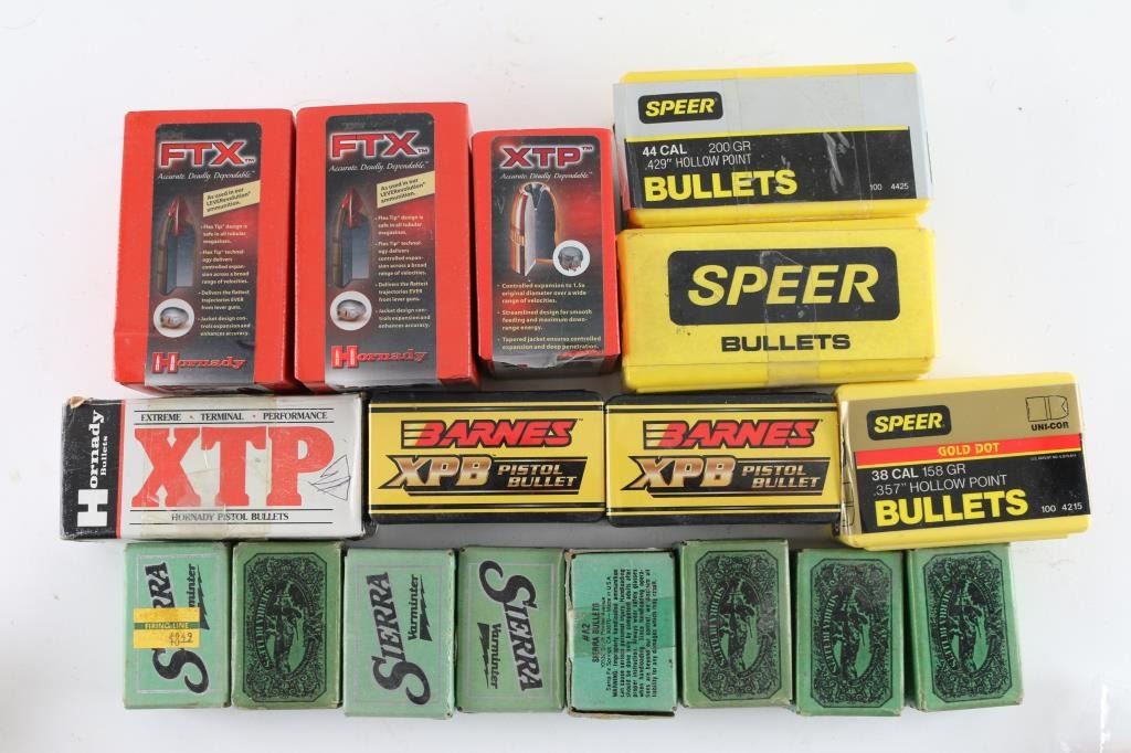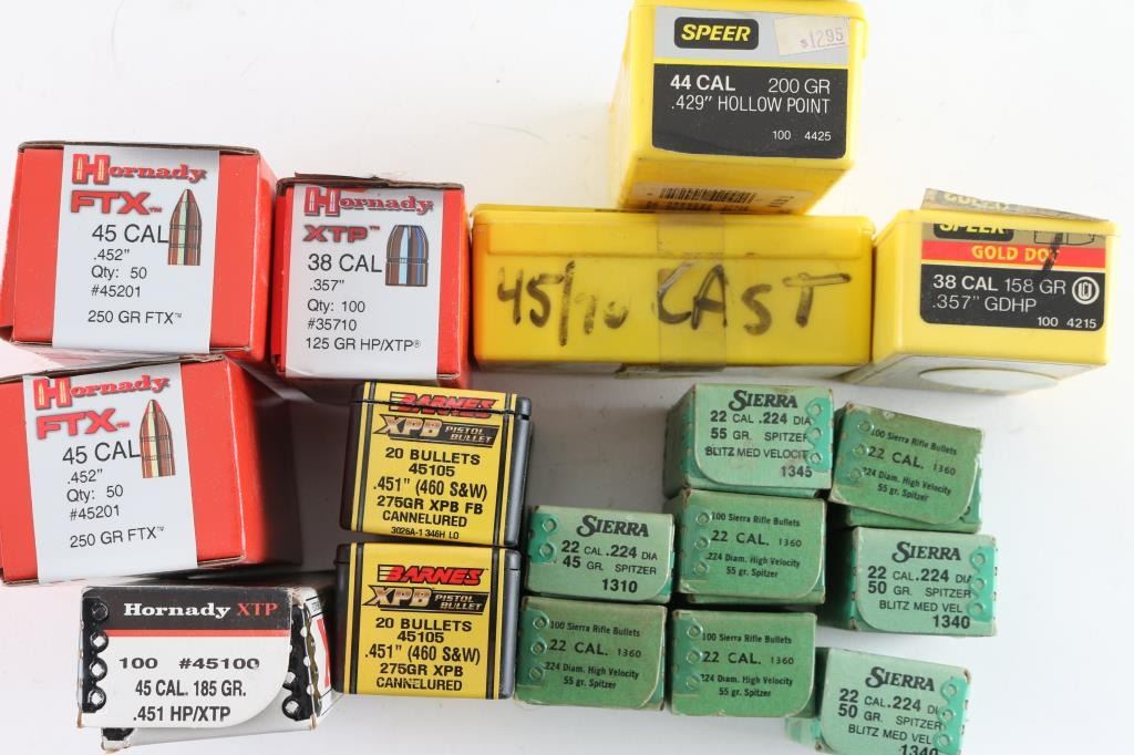 Variety of bullets (approximate weight in container in pounds): 45-70 cast - 2.50; .44 caliber - 1.20; .41 caliber - 0.60; .45 caliber - 0.20; .38 caliber - 2.20; .460 S&W - 1.75; .22 caliber - 5.95; .45 caliber - 3.55; .38 caliber - 1.85; .45 caliber - 1.10; Unknown caliber - 0.55.