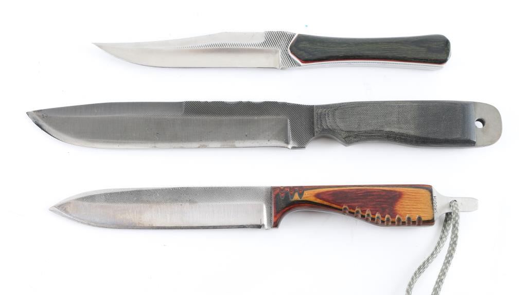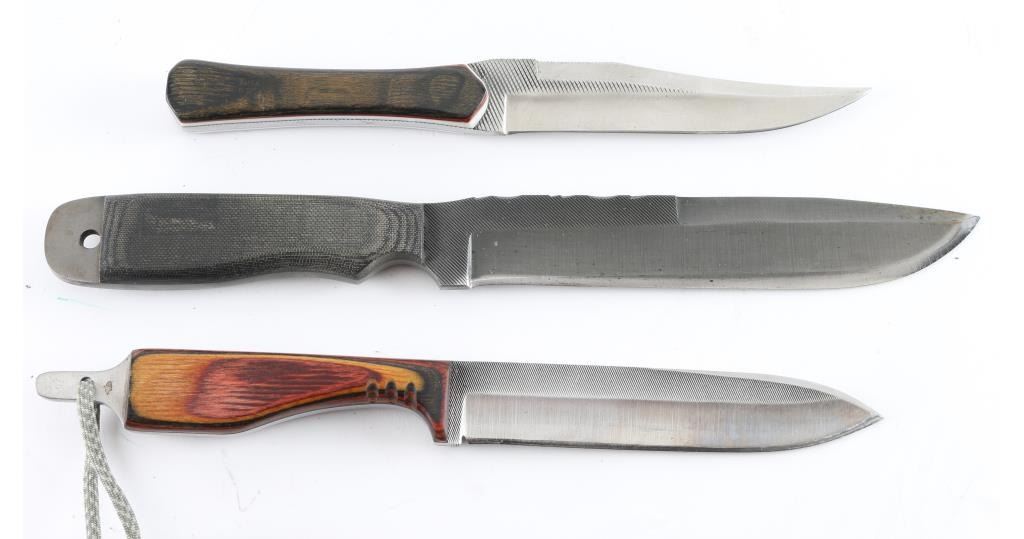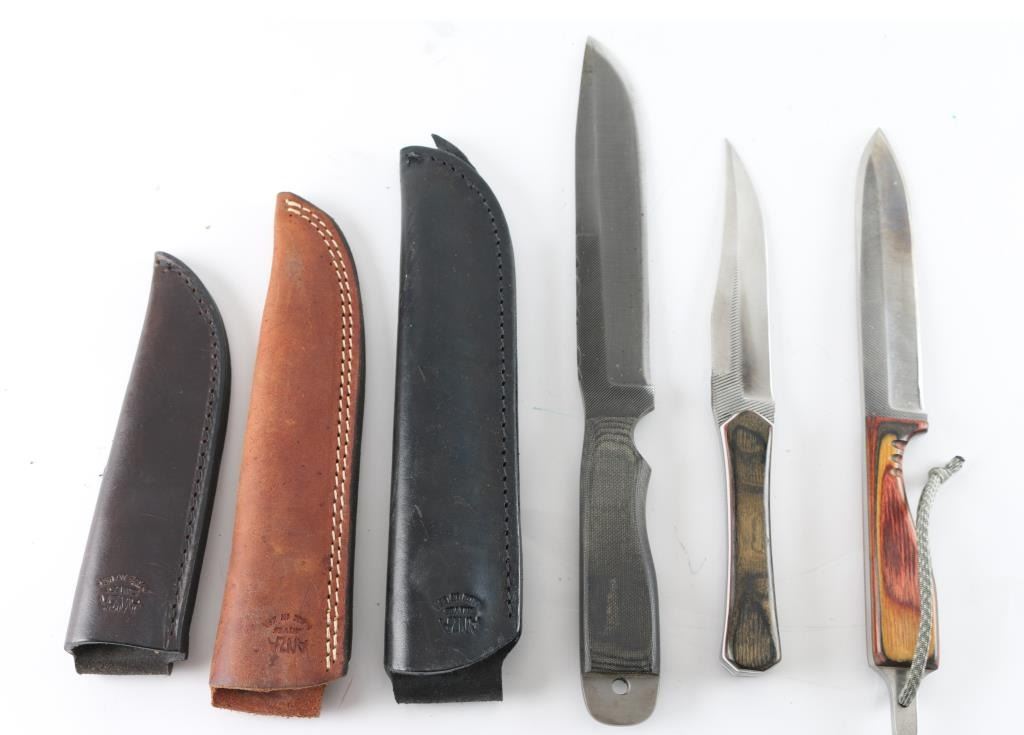 (1) Anza with wood handle 10"overall with 6" straight blade with leather sheath (1)Anza Coffin handled with wood 10" with 6: blade (1)Largest straight blade with micarta handle measures 12"overall with a 7" blade with leather sheath