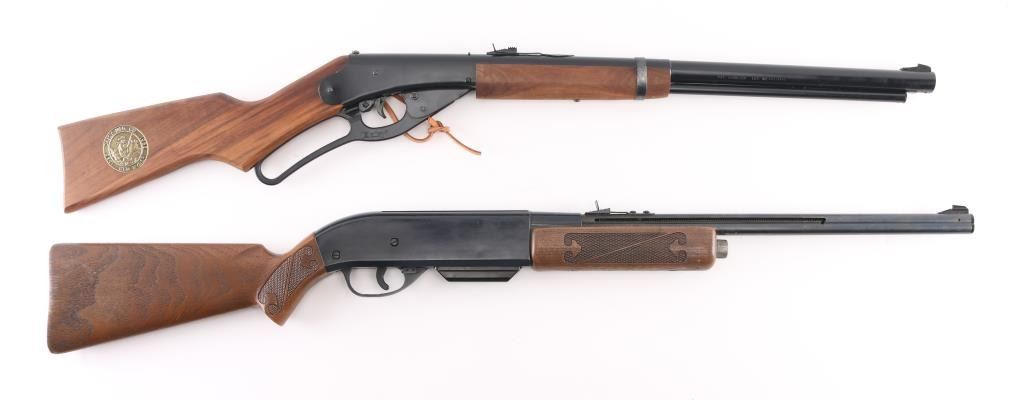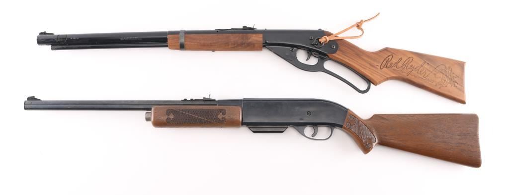 1) Vintage Crossman Powermatic 500 single powerlet, 50 shot semi-automatic Co2 air rifle. Manufactured 1970-79. Still has the Co2 cover. Very good condition. 2) New in box Vintage Daisy Red Rider BB gun. Model # 1938B,. 50th Anniversary edition. Real wood walnut stock & forearm, saddle ring and leather tie. Medallion in the stock. (1938-1988) .650 shot 177 cal. repeater. Comes with all instructions and safety manuals. Like new condition.