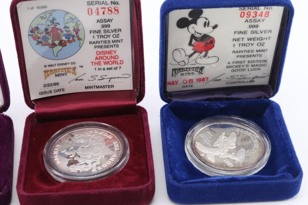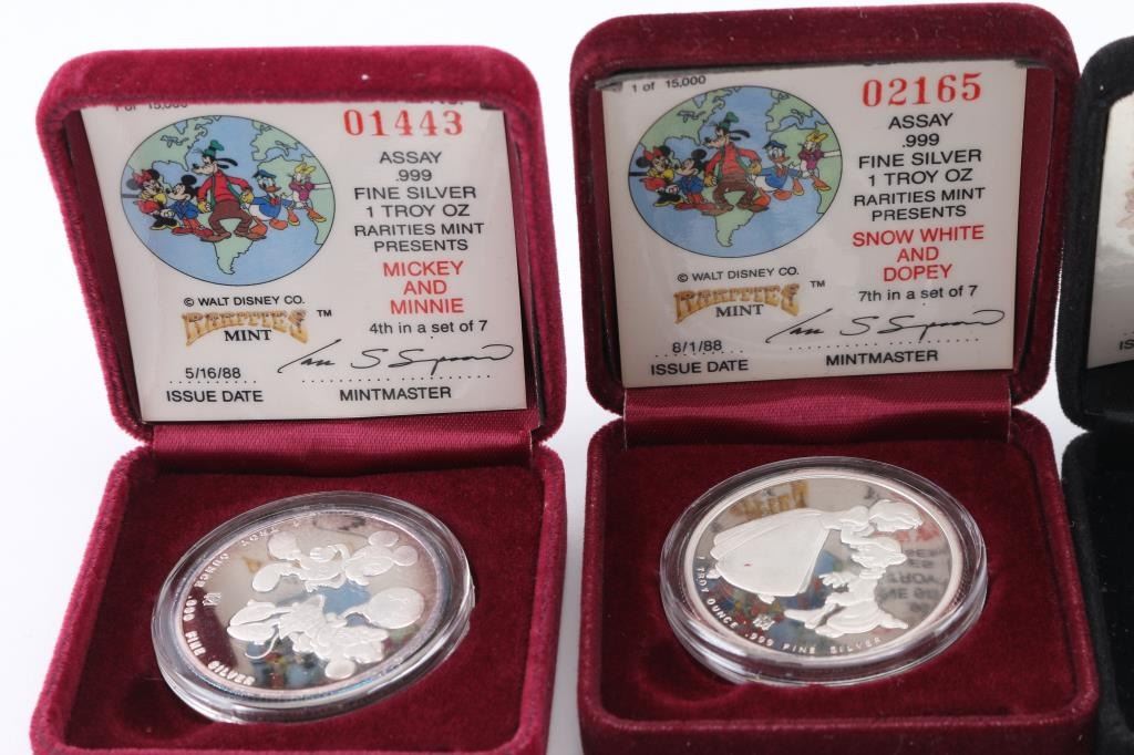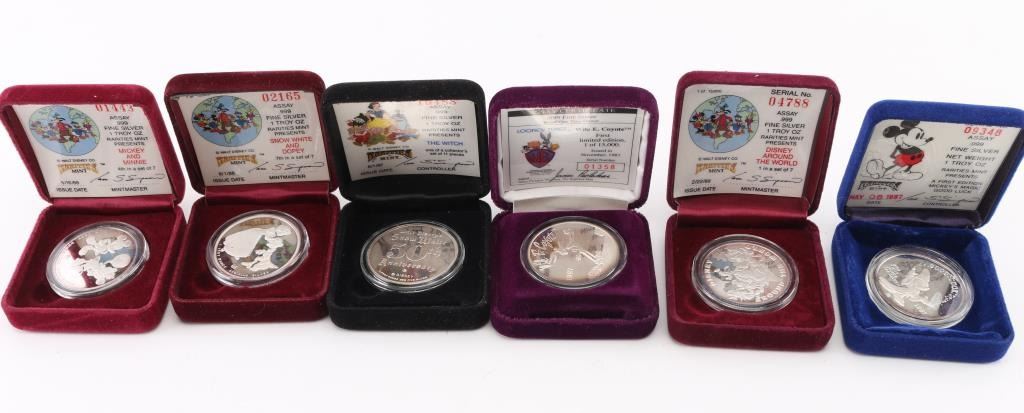 (1) 1 Troy Oz .999 silver Snow White & Dopey 1988 (1) 1 Troy Oz .999 silver Disney Around the World 1988 (1) 1 Troy Oz .999 silver The Witch 1987 (1) 1 Troy Oz .999 silver A First Edition Mickeys Magic Good Luck 1987 (1) 1 Troy Oz .999 silver Mickey & Minnie 1988 (1)1 Troy Oz .999 silver Wile Coyote 1987
