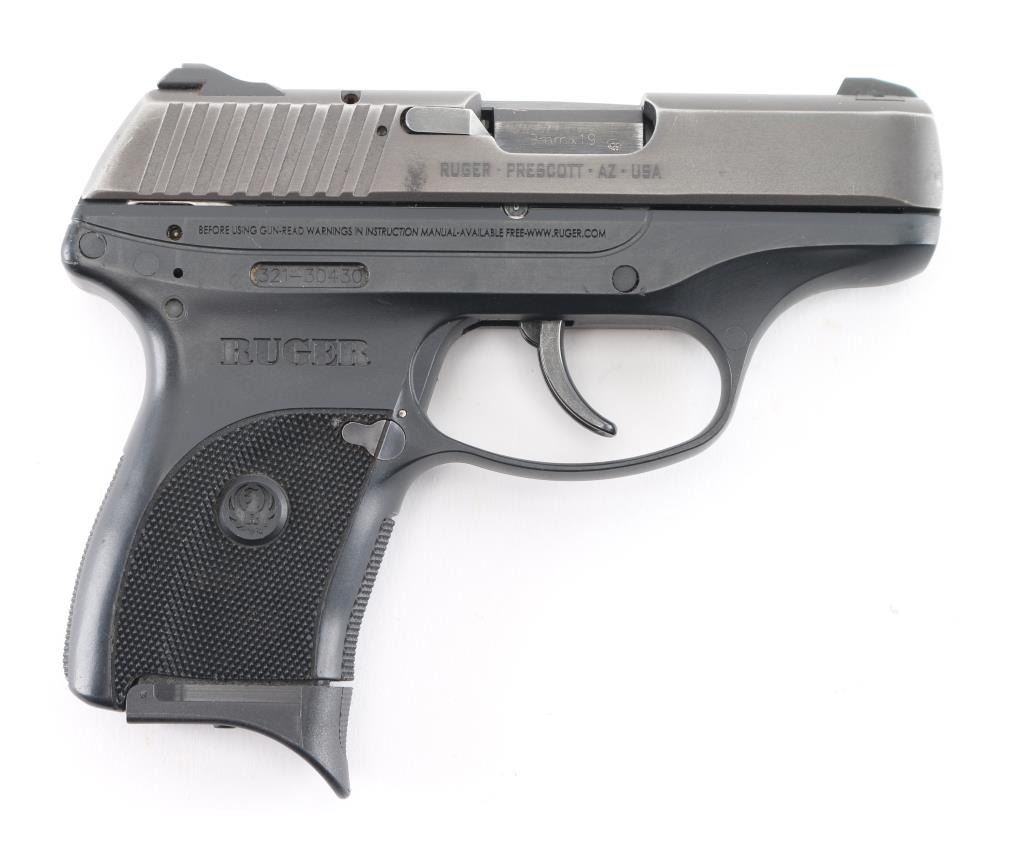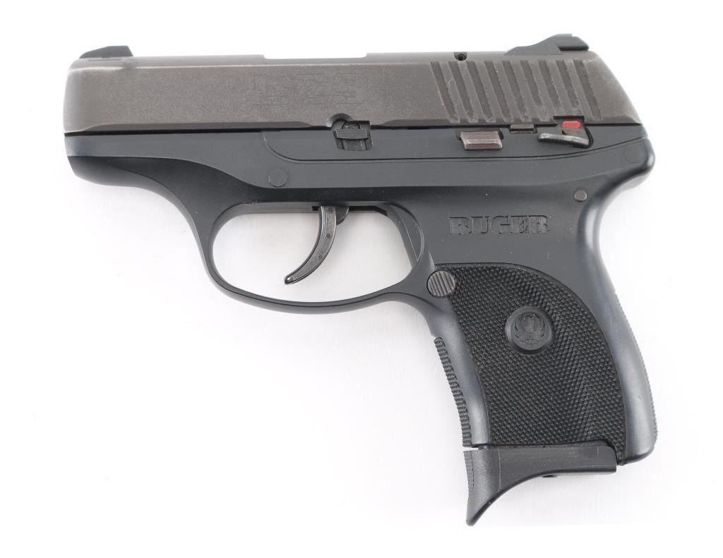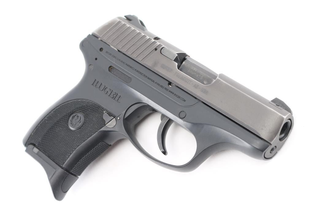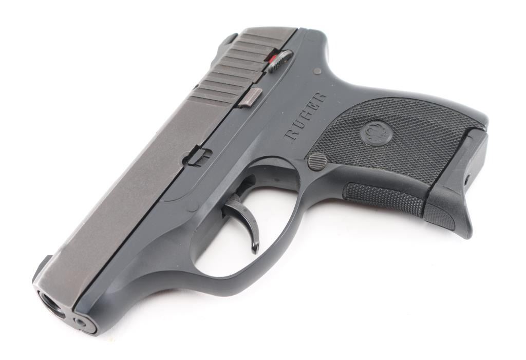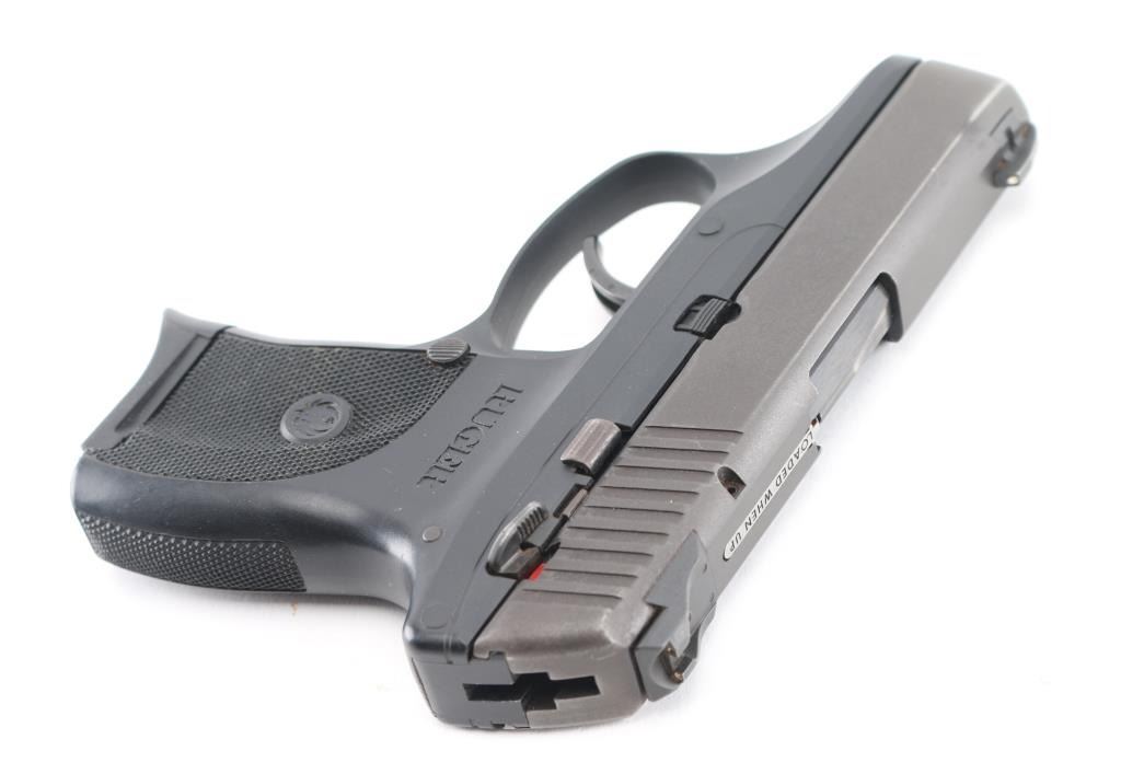 Semi-automatic pocket pistol chambered in 9MM. 3" barrel, black oxide slide with matte black finish with serrations on back, fixed blade front sight with white dot and fixed square notch rear sight with white dots, recessed hammer, polymer frame with checkered grip with Ruger logo, frame manual safety, push button magazine release and slide release. Slide has visible signs of wear on all corners. Comes with (1) six round metal magazine with pinky extension. Bore is excellent with a smooth action. Condition is NRA Excellent. Modern Firearm.