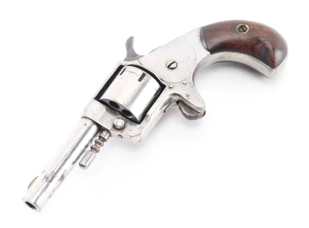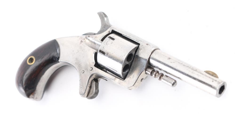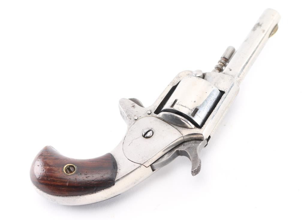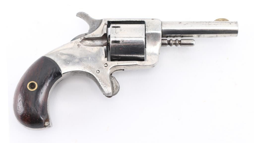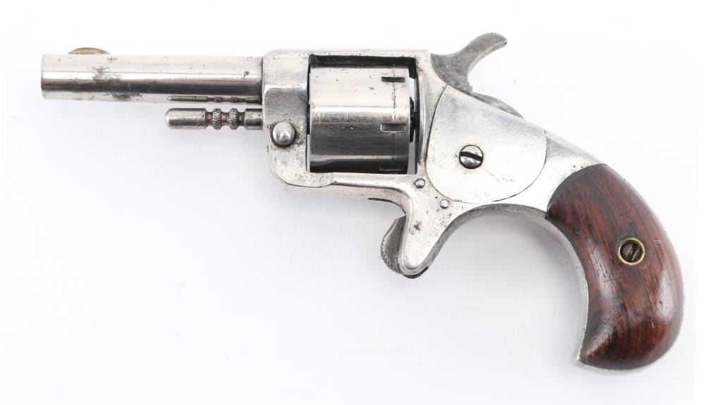 Single action 7 shot spur trigger pocket revolver chambered in .22 Short circa 1870-1880. 2.25" barrel, nickel plated finish, brass half moon blade front sight, non-fluted seven-shot cylinder, checkered spur trigger, checkered hammer spur and smooth two-piece wood bird's head grips. Revolver retains 80% of it's nickel plated finish with some light scattered pitting. Action is in very good with good lock-up, bore smooth but dirty, wood grips are good with right grip panel chip on the bottom front. Condition is NRA Good. Antique Firearm.