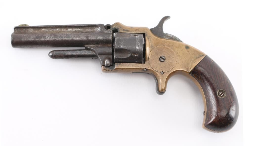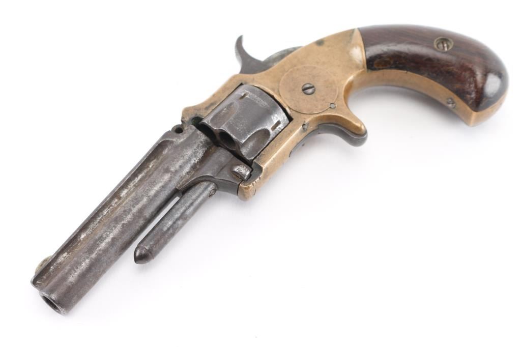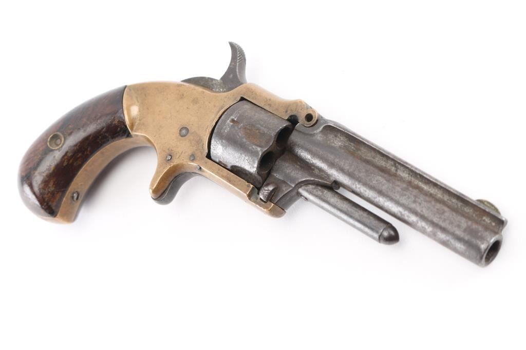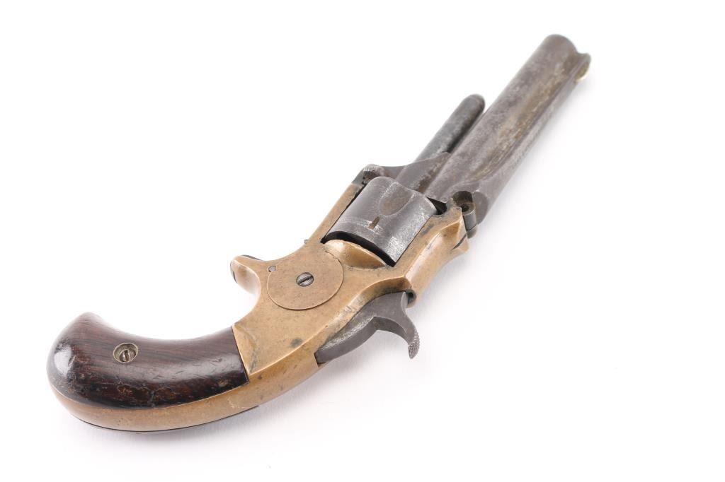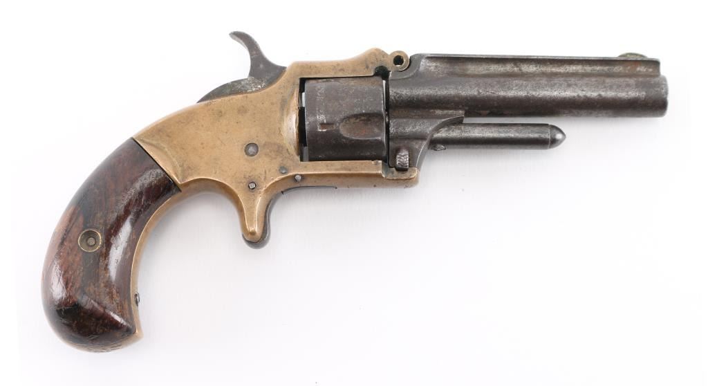 Nickel plated brass and steel single-action spur trigger 7-shot pocket revolver with a 3" tip-up barrel with half moon brass blade front sight and wood grips. Hinge on top of frame is broken with missing hinge pin/screw. Nickel finish is non-existent with rust and pitting throughout, frame retains about 2% brass finish. The bore is good, but dirty with strong rifling. Chambers are good, but dirty. Wood grips are good with some scratches and wear. Action is broken. Condition is NRA Poor. Antique Firearm.