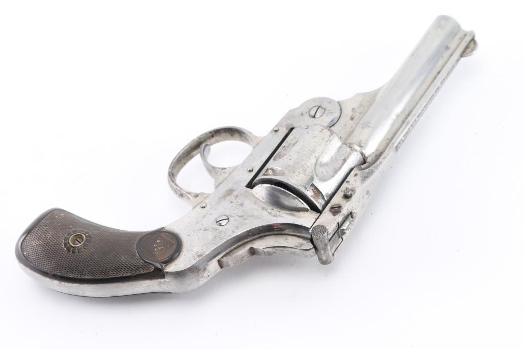 top break double action revolver with 3.25” ribbed round barrel with half moon blade fixed front sight and v-notched rear, smooth trigger and spur-less external hammer, nickel finish with black hard rubber checkered grips with target logo. Bore and chambers are very good, but dirty. Hammer will not reset and ejector not working. Retains 60% of it's finish with some pitting and scrapers throughout. Condition is NRA Poor. Modern Firearm. C&R Eligible