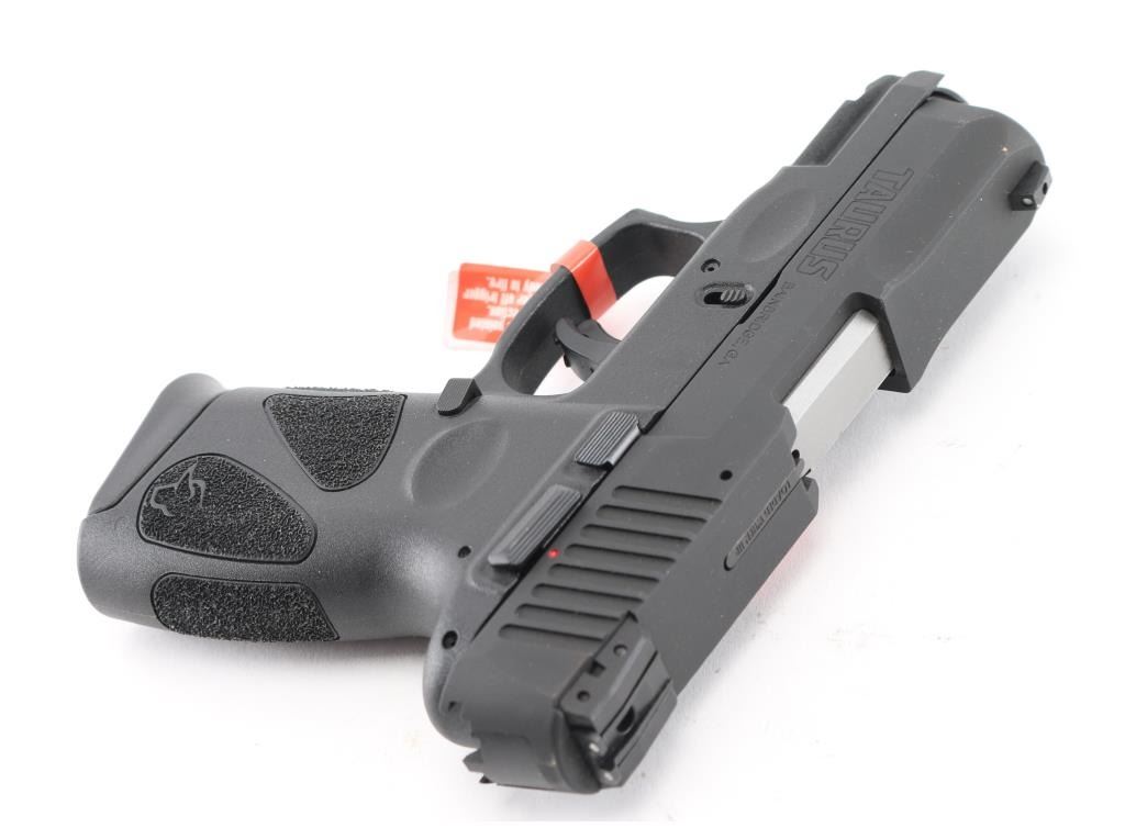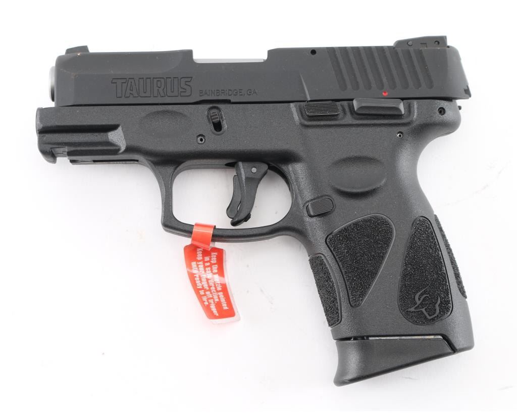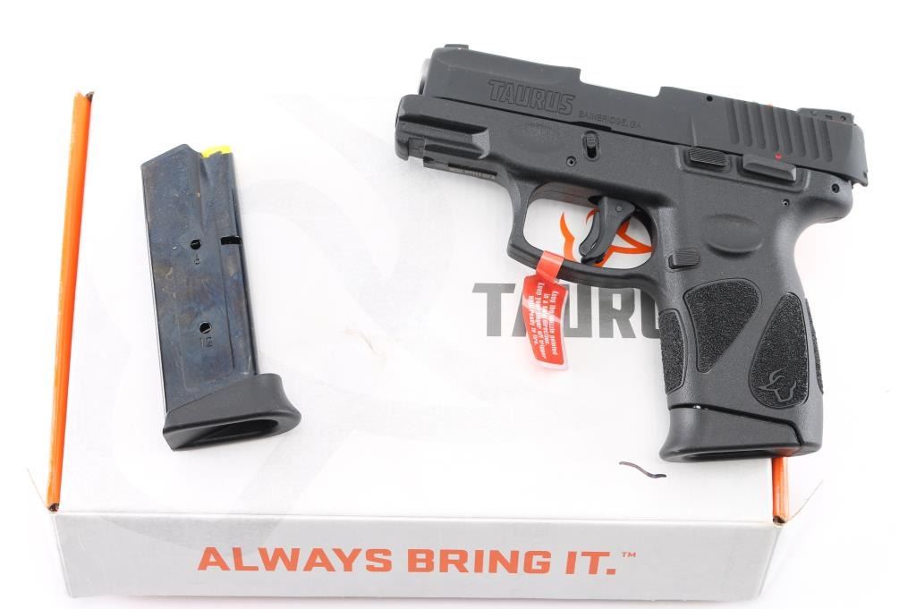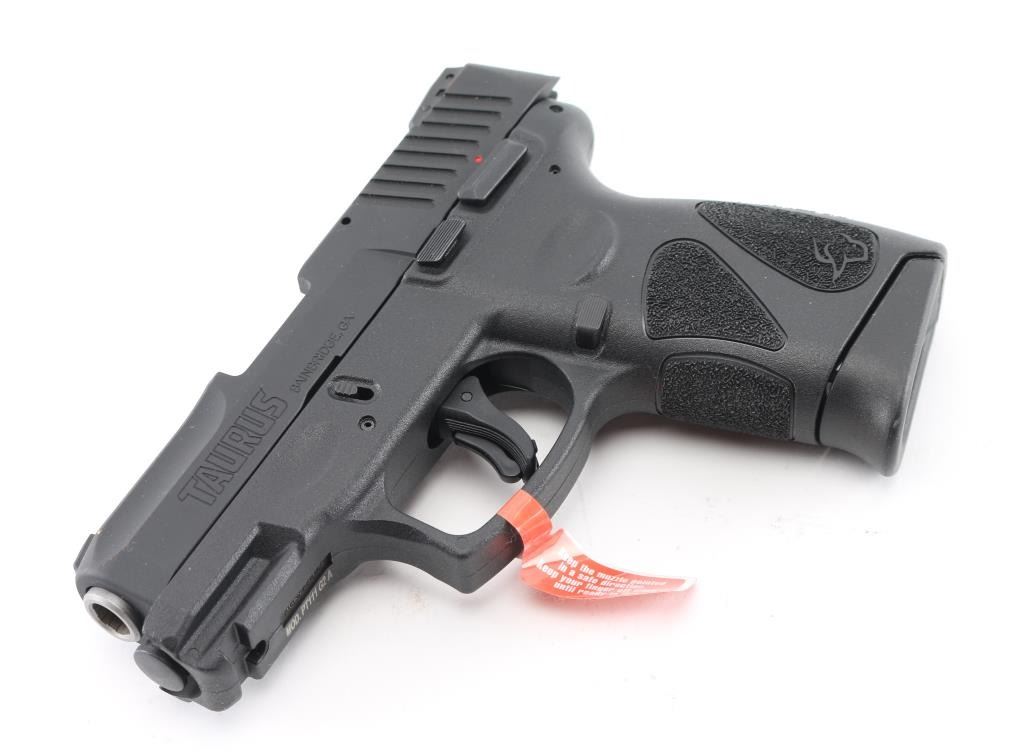 'Millennium' Brazilian made compact semiautomatic pistol. Features matte black finish, textured polymer grip frame with accessory rail, 3.2" barrel, loaded chamber indicator, 3 dot sights with adjustable rear, manual thumb safety, manual trigger safety, Taurus locking system in slide, double action only (DAO) with re-strike capability, capable of firing with magazine removed, push button magazine release. Bore is bright. Includes (2) 12-rd magazines with pinky extensions, factory cardboard box. Condition is NRA Excellent *** Modern Firearm ***
