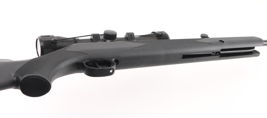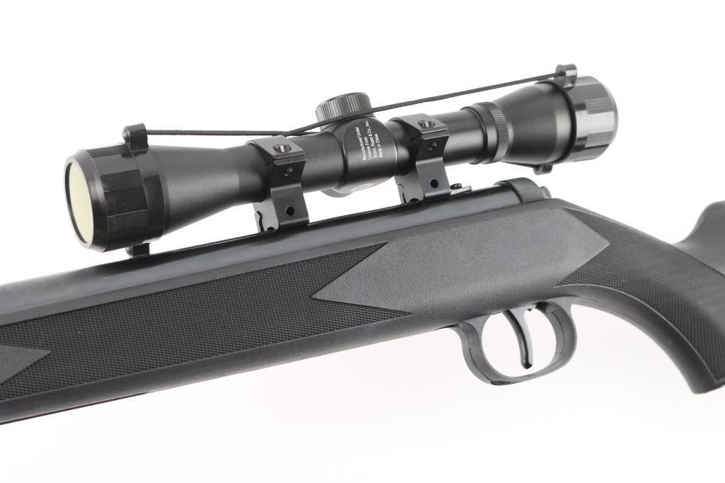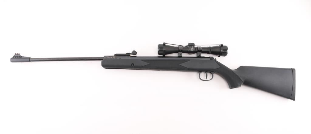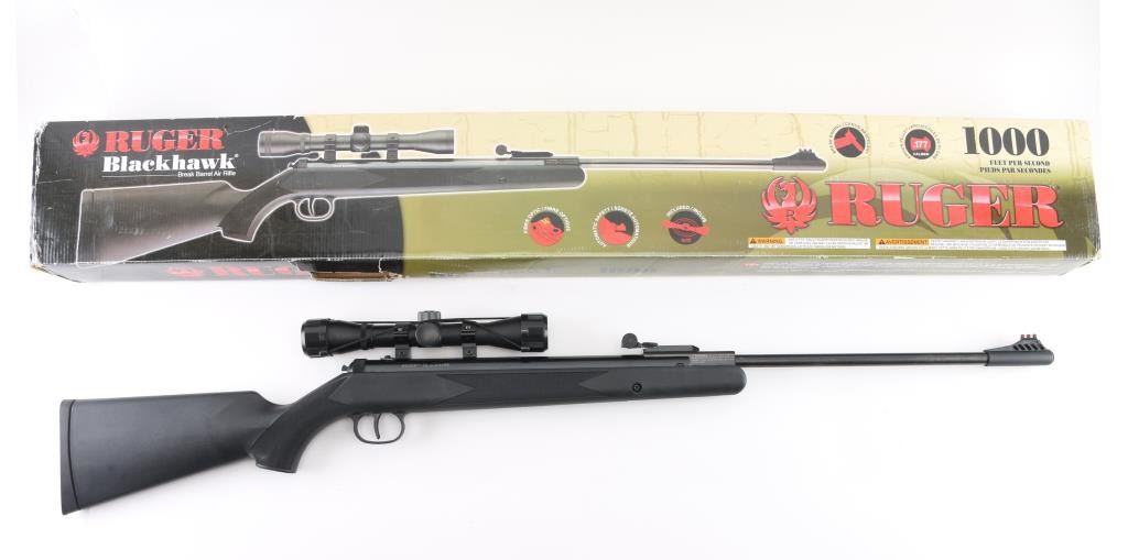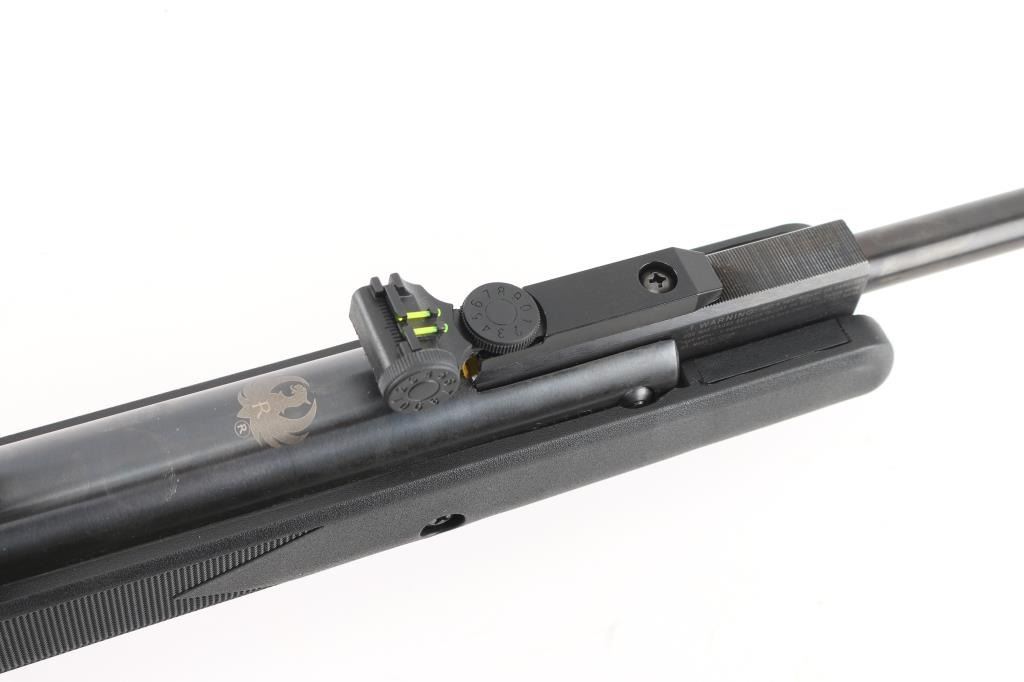 Single shot break-barrel spring powered air rifle, made in China by Umarex for Ruger. Features blued finish, black polymer stock, 18.6" barrel, fiber optic insert adjustable sights, automatic safety, 4x32mm scope. Overall like new condition, with factory box. Condition is NRA Excellent - like new *** 'Antique' Firearm ***