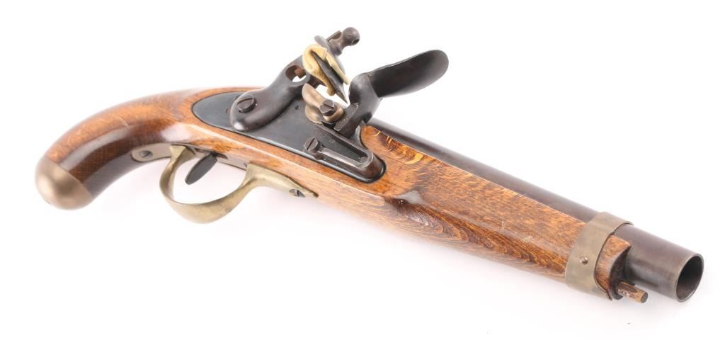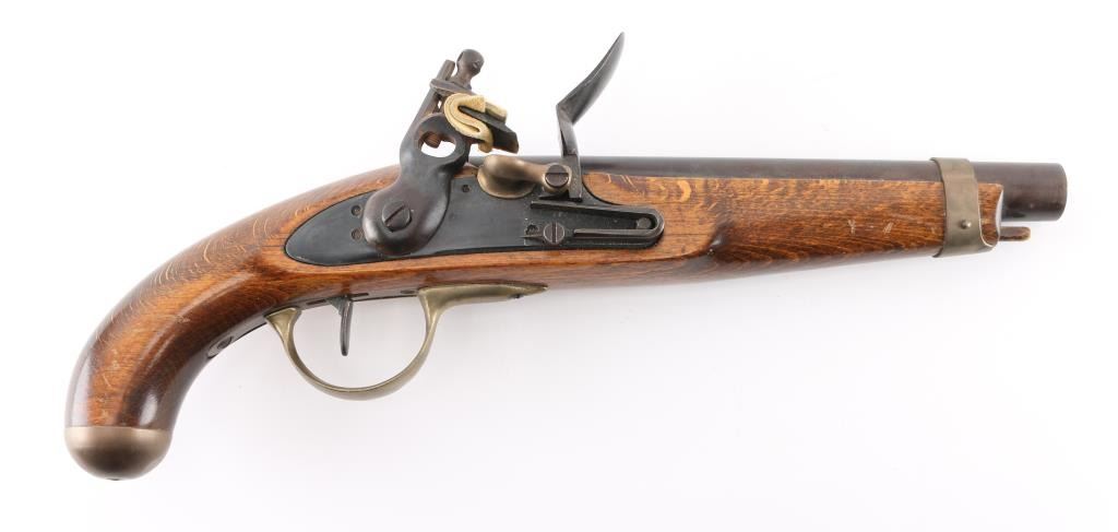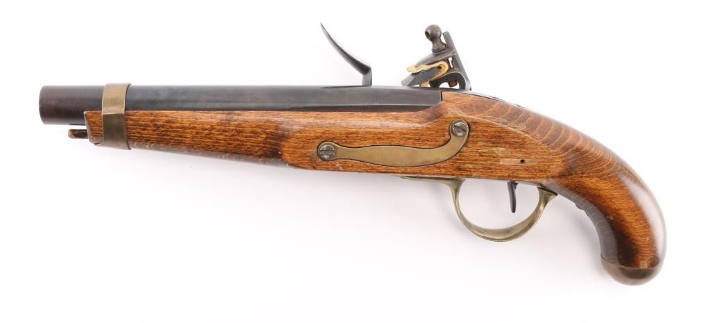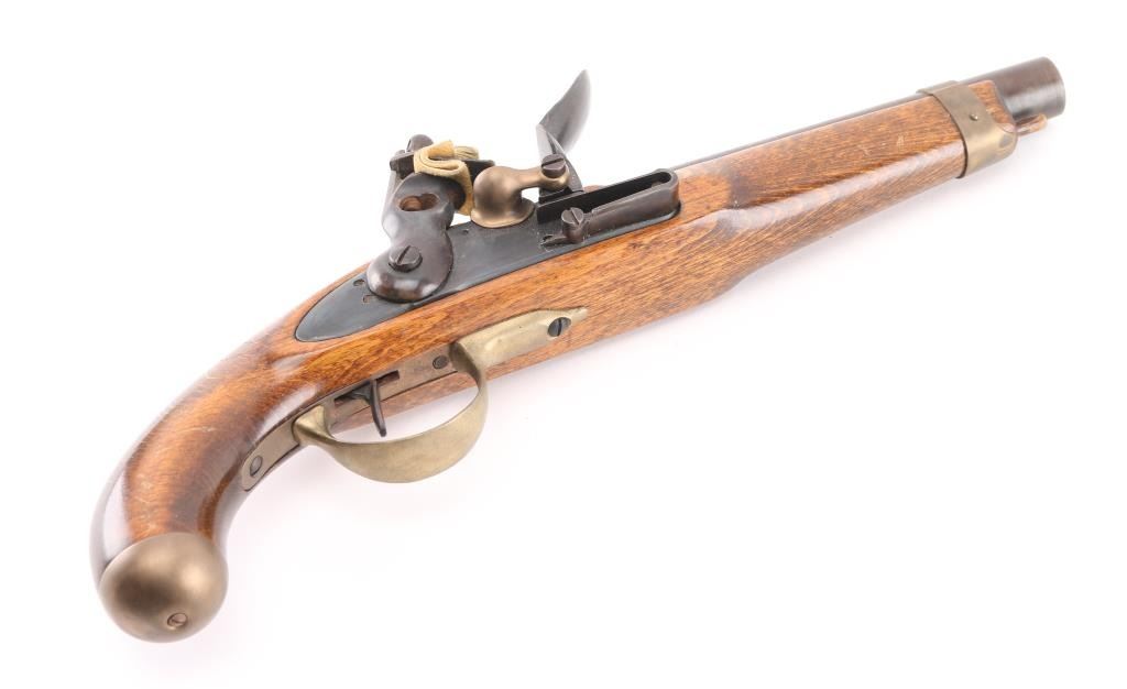 Massive reproduction flintlock pistol. brass fittings, wood ramrod, Hammer does not stay cocked. Needs repair. Made in the 1950's. NRA Condition-Fair-Needs Repair. Antique Firearm.