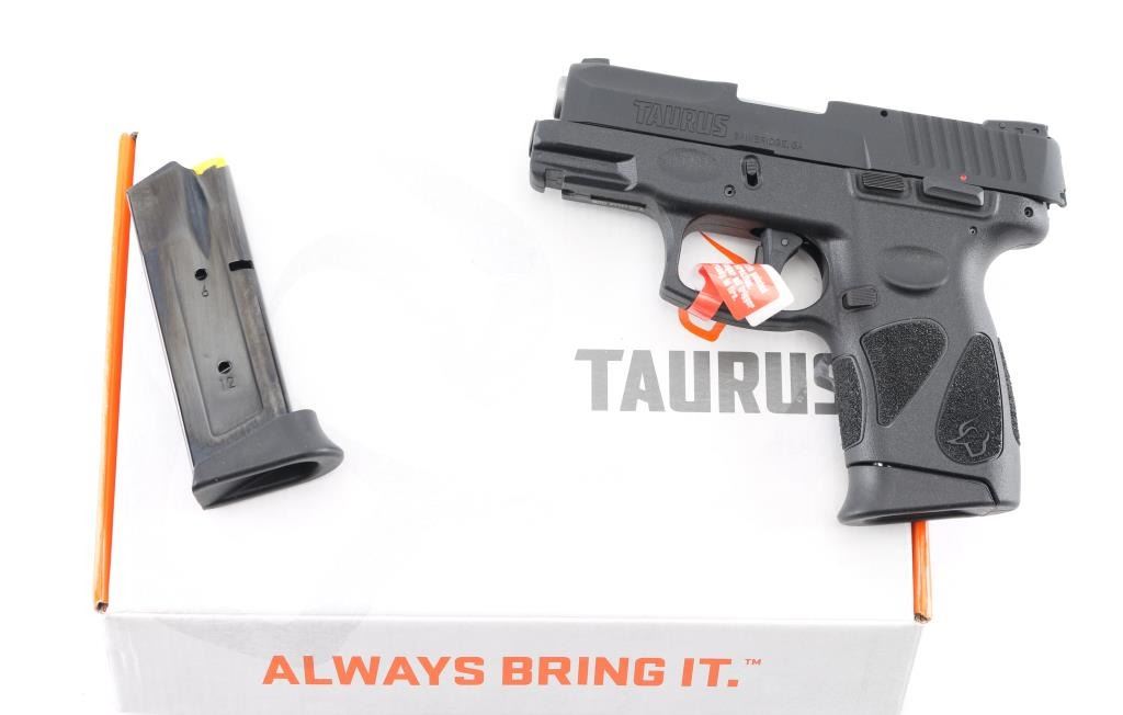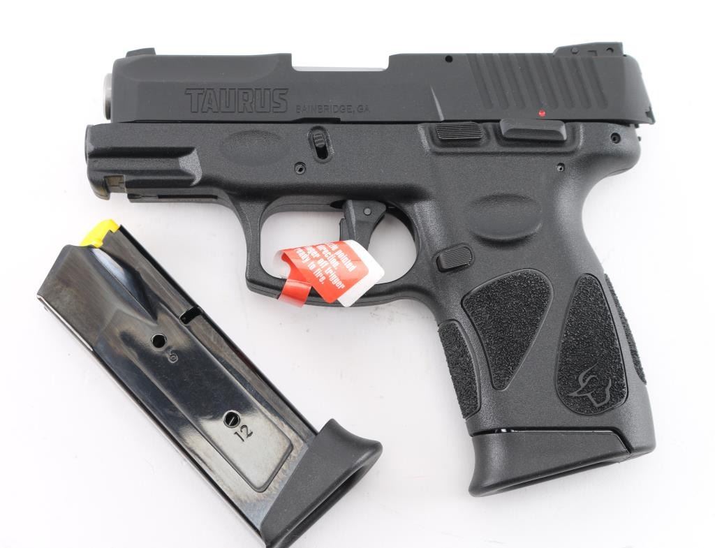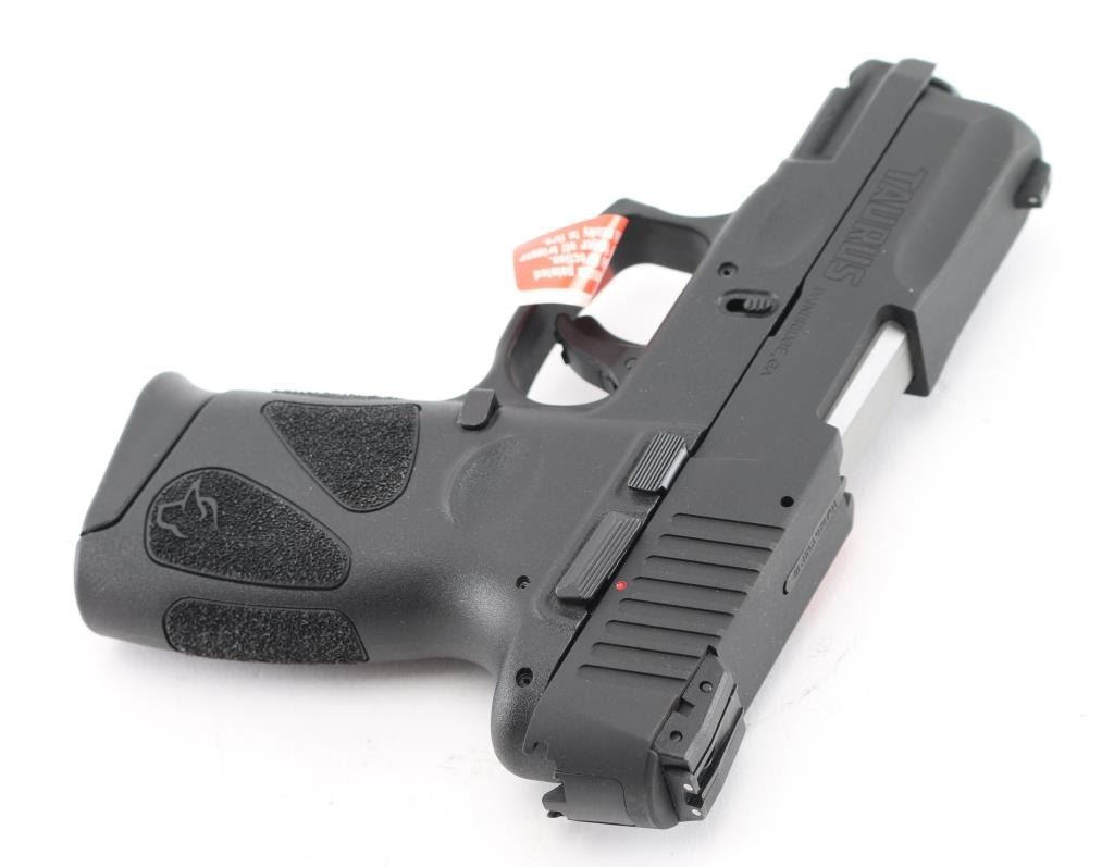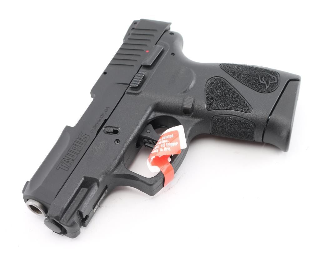 'Millennium' Brazilian made compact semiautomatic pistol. Features matte black finish, textured polymer grip frame with accessory rail, 3.2" barrel, loaded chamber indicator, 3 dot sights with adjustable rear, manual thumb safety, manual trigger safety, Taurus locking system in slide, double action only (DAO) with re-strike capability, capable of firing with magazine removed, push button magazine release. Bore is bright. Includes (2) 12-rd magazines with pinky extensions, gun lock and factory cardboard box. Condition is NRA Excellent *** Modern Firearm ***