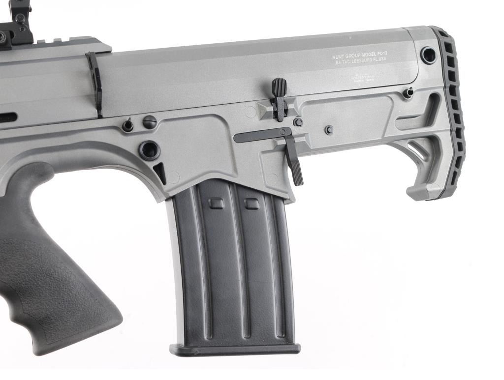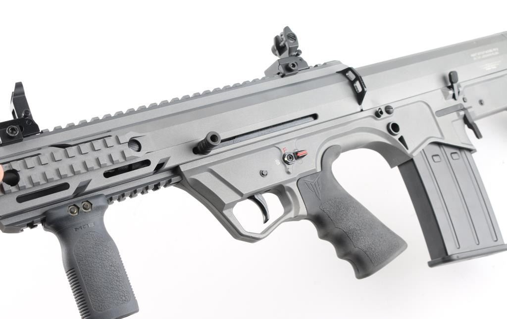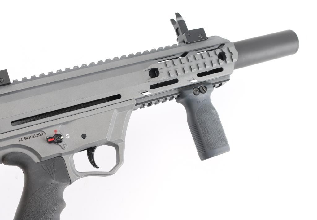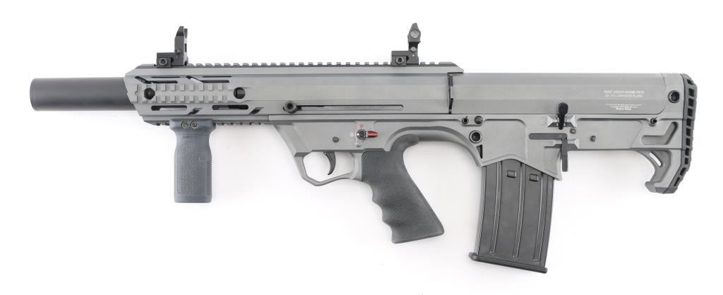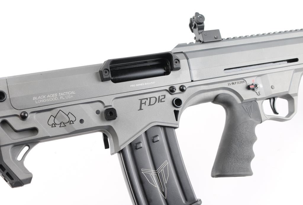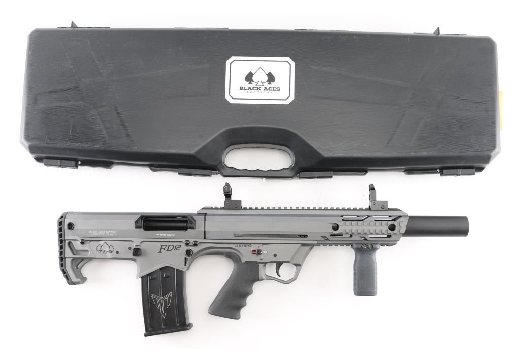 Manufactured in Turkey, imported by Black Aces Tactical of Longwood. FL. "Bull Pup" style semi-automatic tactical shotgun chambered for 2 3/4", & 3" 12 Ga. shells. 18.5" barrel , sniper gray finish, full choke insert with 4.75" barrel shroud attached, vented handguard with full length Picatinny top rail with front quad rails sides and bottom, ambidextrous manual safety and magazine release, reversible charging handle, shell deflector and front vertical foregrip attached, finger contoured rubber grip, (2) 5 rd magazines. Comes in black plastic factory case, with spare magazine, spare front fore grip and (3 total) chokes tubes w/tool. NRA Condition is Excellent. Modern Firearm.