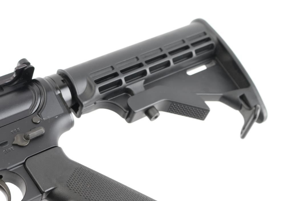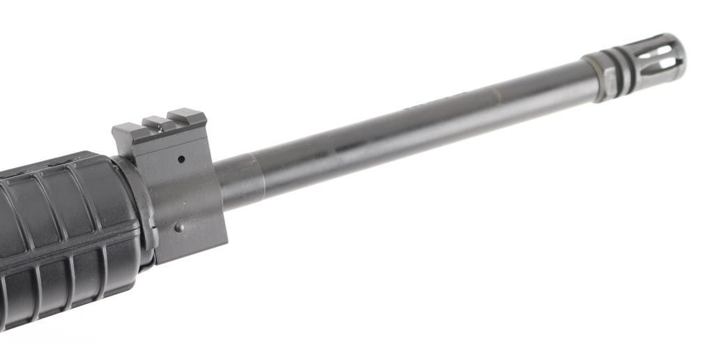 Semiautomatic rifle chambered in 5.56mm NATO, matte black finish, 16" barrel with1:9 twist and A2 flash hider, Picatinny rail front sight gas block, standard AR forearm and pistol grip, Ken Elmore-style 6 position collapsible buttstock with sling swivel, standard manual safety, brass deflector, forward assist and charging handle. Comes in factory cardboard box with user's manual, (1) 30 round Pmag and lock. Condition is NRA Excellent. Modern Firearm.