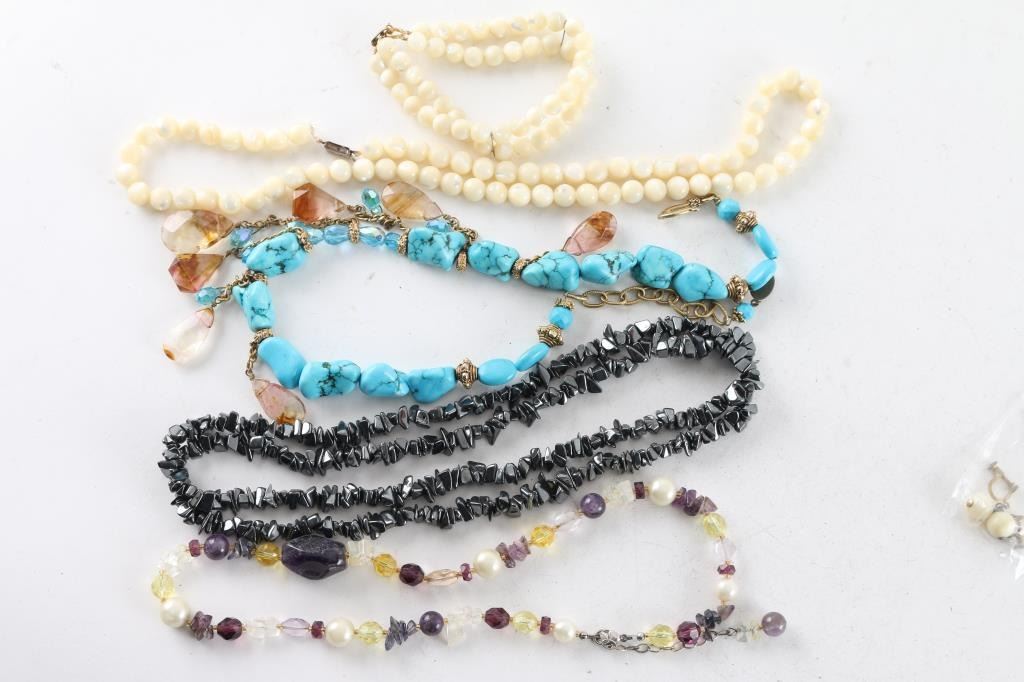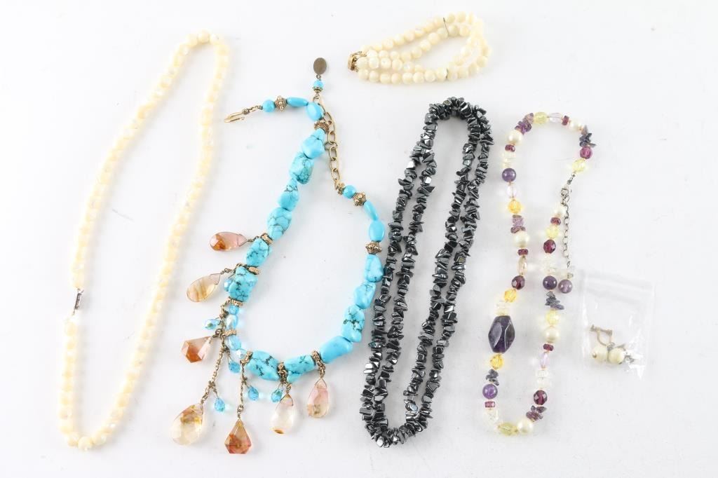 (1) MOP set necklace, bracelet and earrings (1) Hematite Beaded necklace (1)Turquoise & Calcite Necklace (1) Multi stone necklace