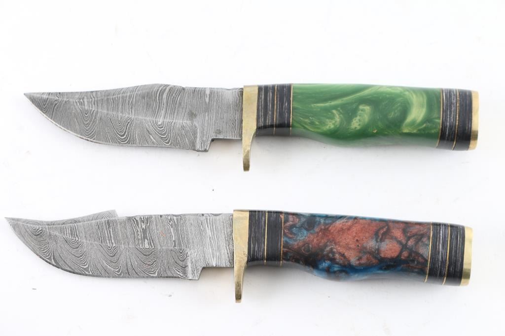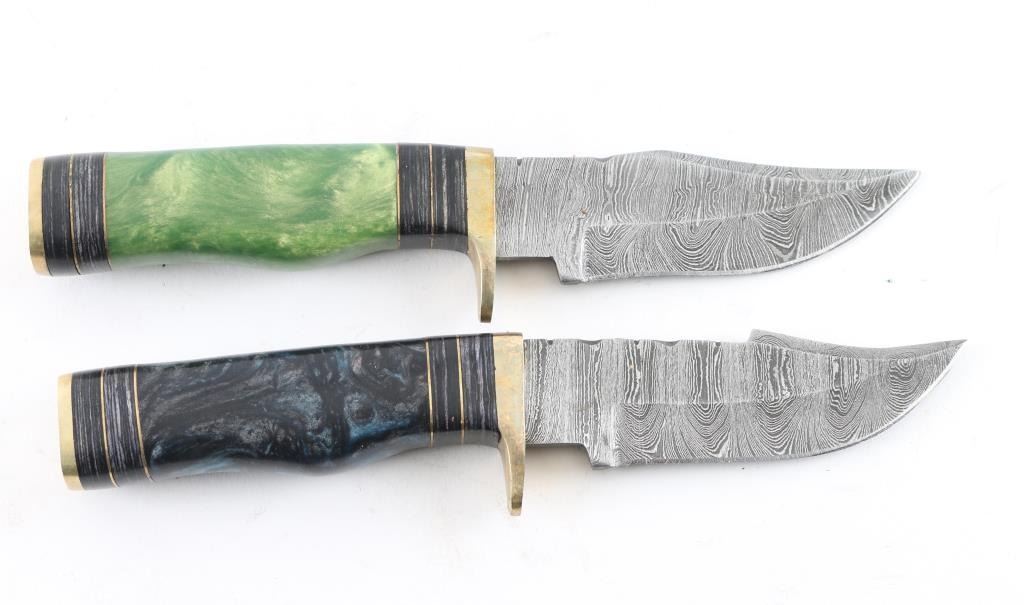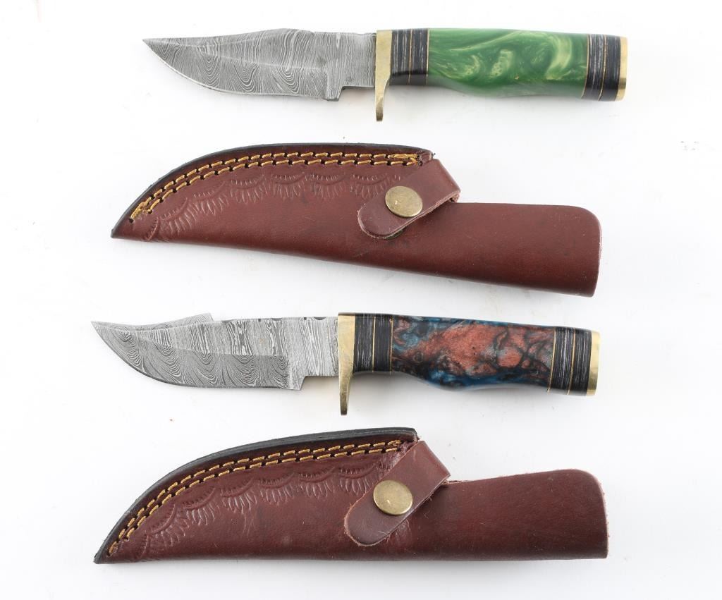 With leather sheaths, both have 4 inch blades with damascus steel.