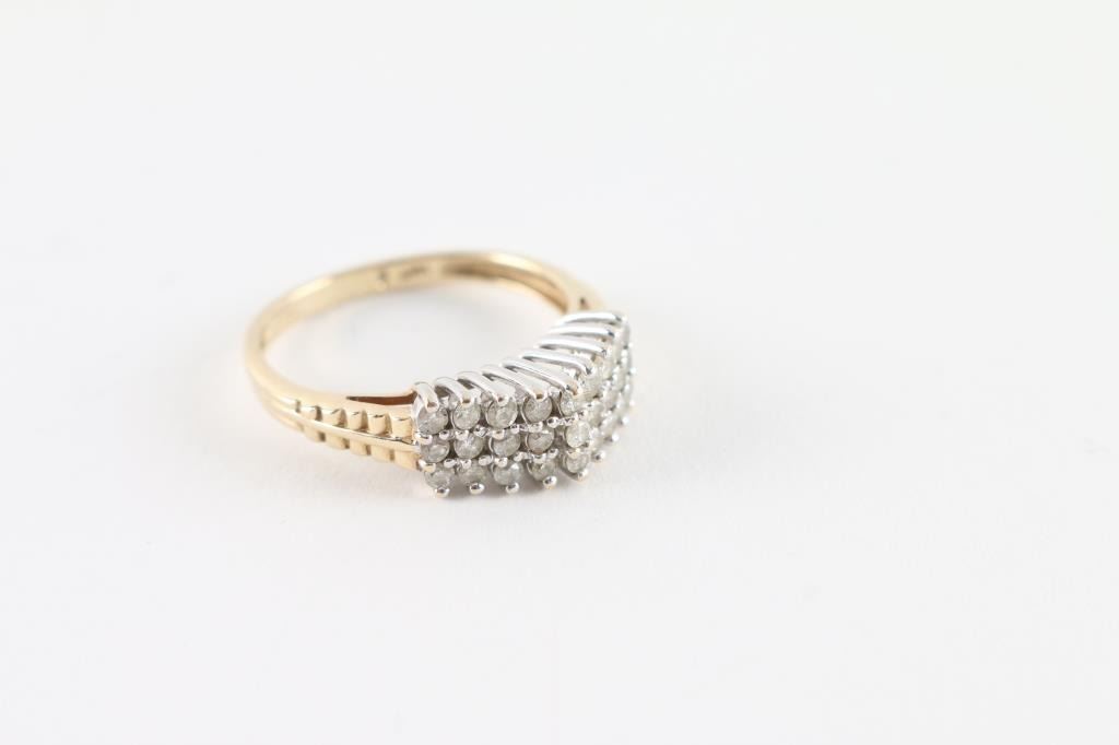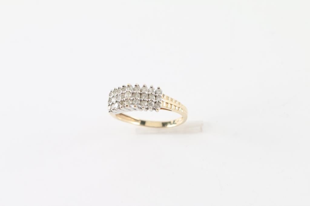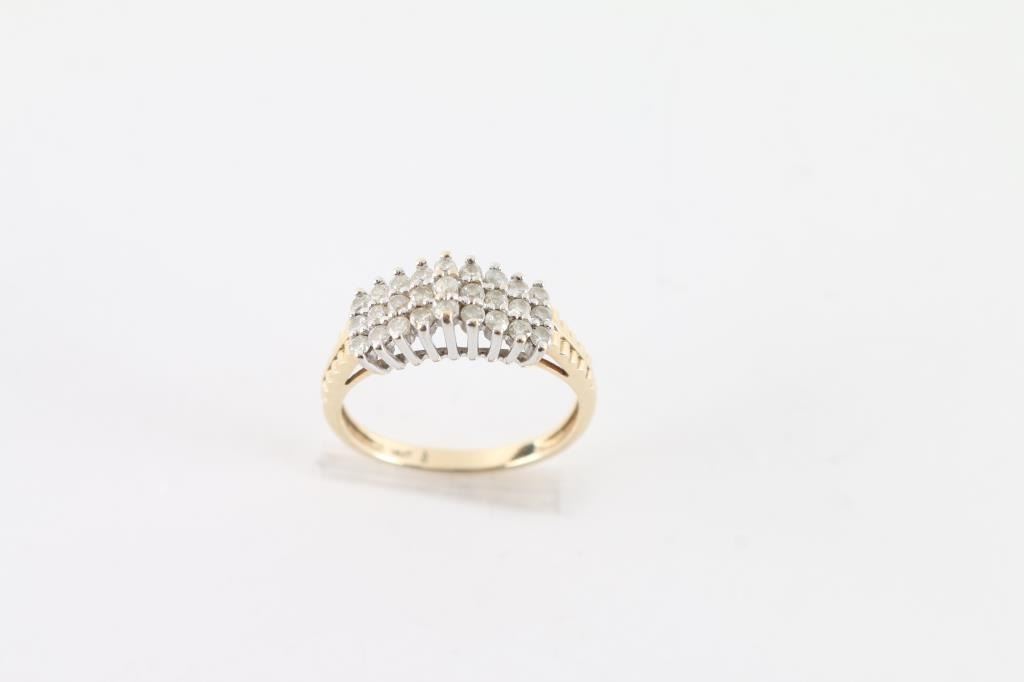 With waterfall design set with 27 prong set diamonds set in white gold with yellow gold shank. Inside is marked 14kt. Diamonds are S/1 and F-J color. Ring is size 8.