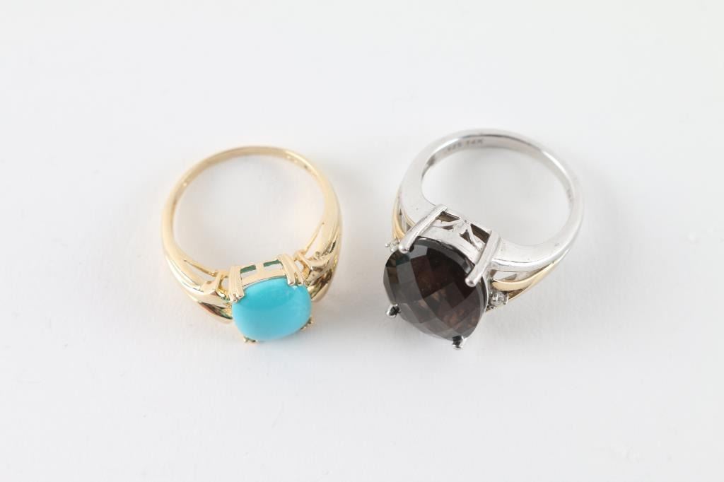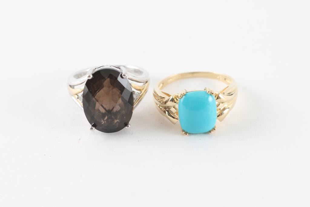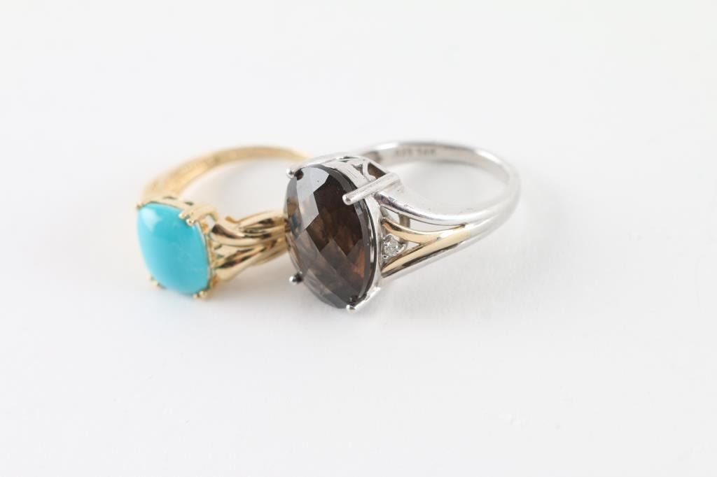 (1) Turquoise Ring Set in 14kt yellow gold (size 8.5) (1) Smoky Topaz Ring set in sterling with small accented diamonds set with 14kt yellow gold (size 7)