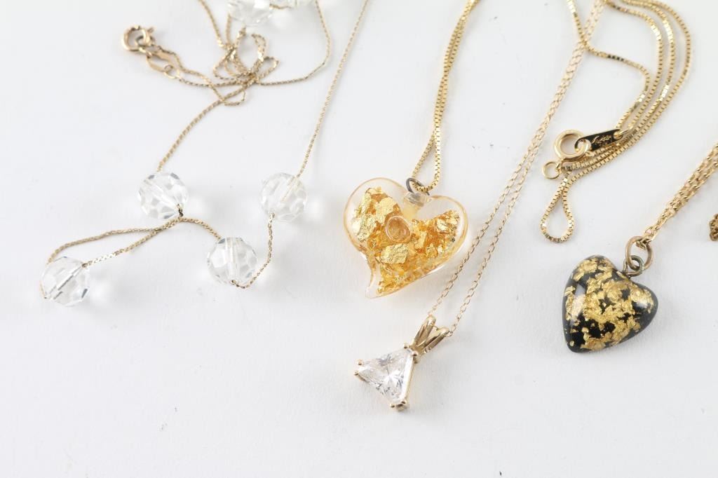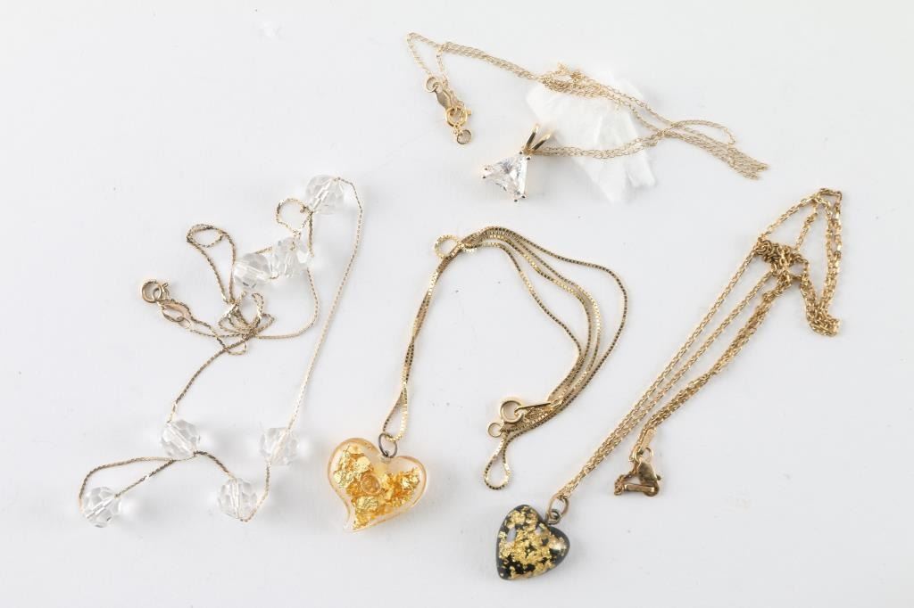 (1) Gold flake Heart Pendant on chain not gold (1) 14K Gold serpentine chain with crystal beads (1) 14Kt yellow gold chain with CZ pendant (1) Gold flake heart pendant on gold chain