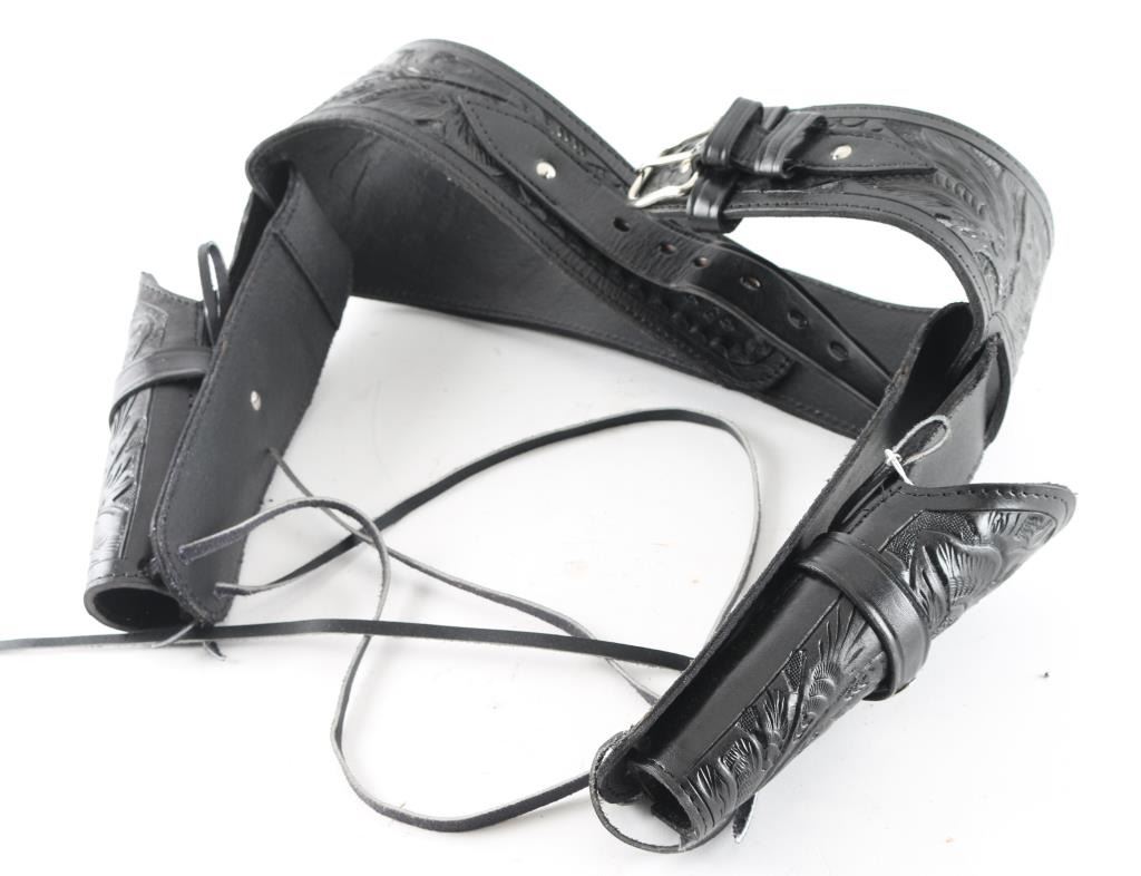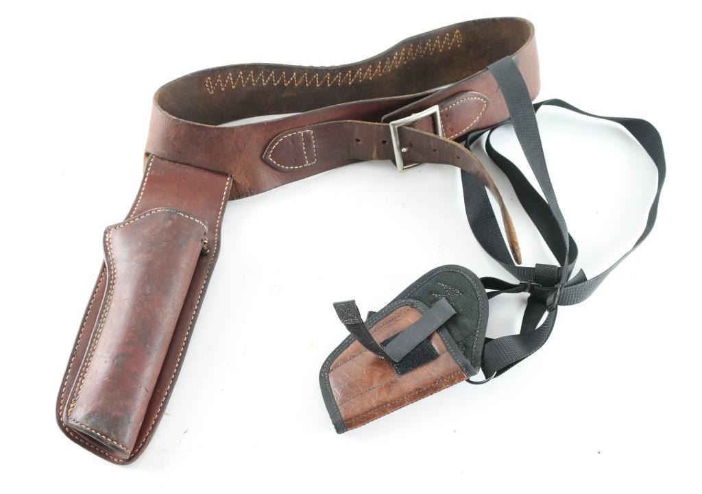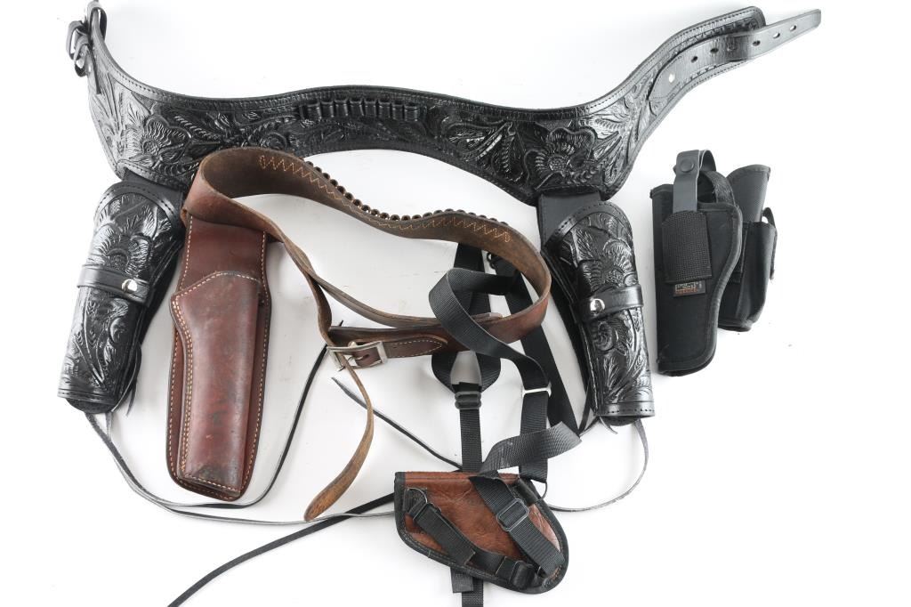 Includes a marked Mexican carved black leather holster belt rig, with two holster fitted for double action revolver. In good condition. (1.) brown leather holster, marked "Hunter" in good condition with some patina on pins, overall good condition, also includes in this lot is 3 concealed carry holster with belt loops and a shoulder holster for small revolvers.