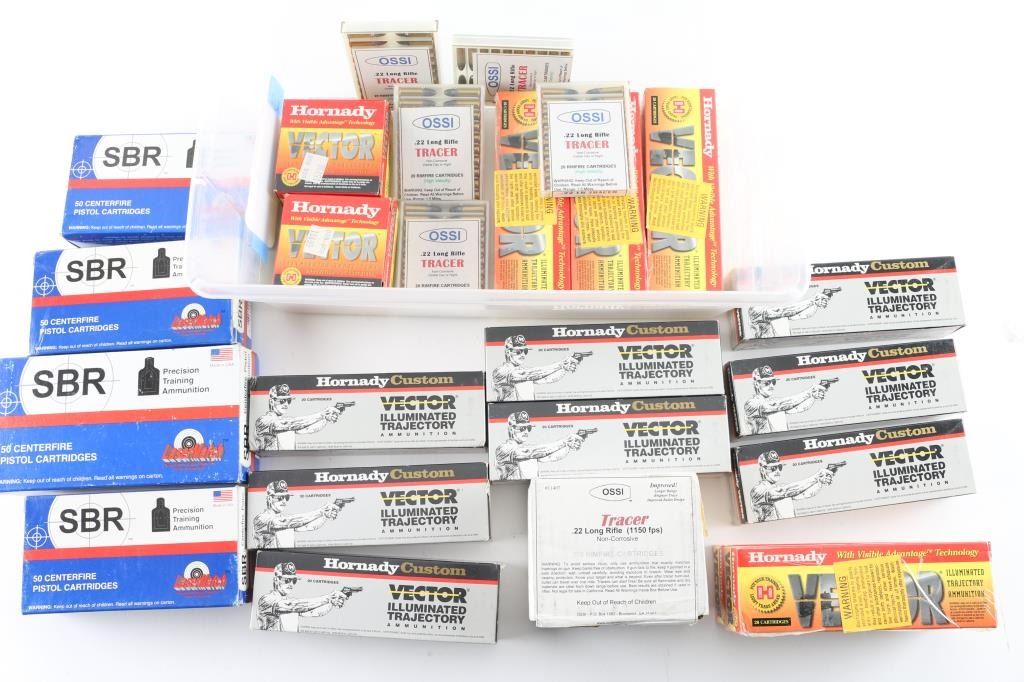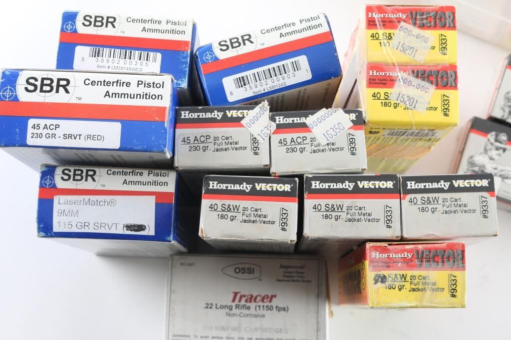 Approx. 830 rounds total. Approx. 180 rounds of Hornady "Vector" .40 S&W ammo. Approx. 50 rounds of Hornady "Vector" 9mm ammo. Approx. 100 rounds of SBR 9mm. Approx. 50 rounds of SBR .45 ACP. Approx. 80 rounds of Hornady "Vector" .45 ACP FMJ. Approx. 50 rounds of SBR .38 Special. Approx. 350 rounds of OSSI .22 LR. May NOT be legal in all jurisdictions, know the laws in your area, See Photo.