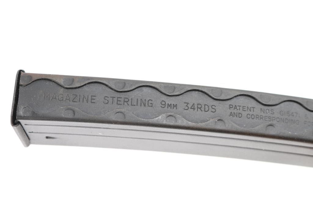 Steel construction 34rd capacity. All appear to be in excellent condition. Unwrapped example marked "MAGAZINE STERLING 9MM 34RDS" & "PATENT NOS 615471 & 692768 IN UK/AND CORRESPONDING FOREIGN PATENTS".