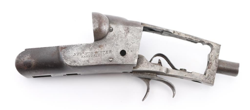 Vintage receiver for a New Worcester hammerless 12 Ga. SxS shotgun. Has the double triggers, spring & the firing pins, no lever or safety. C&R Firearm