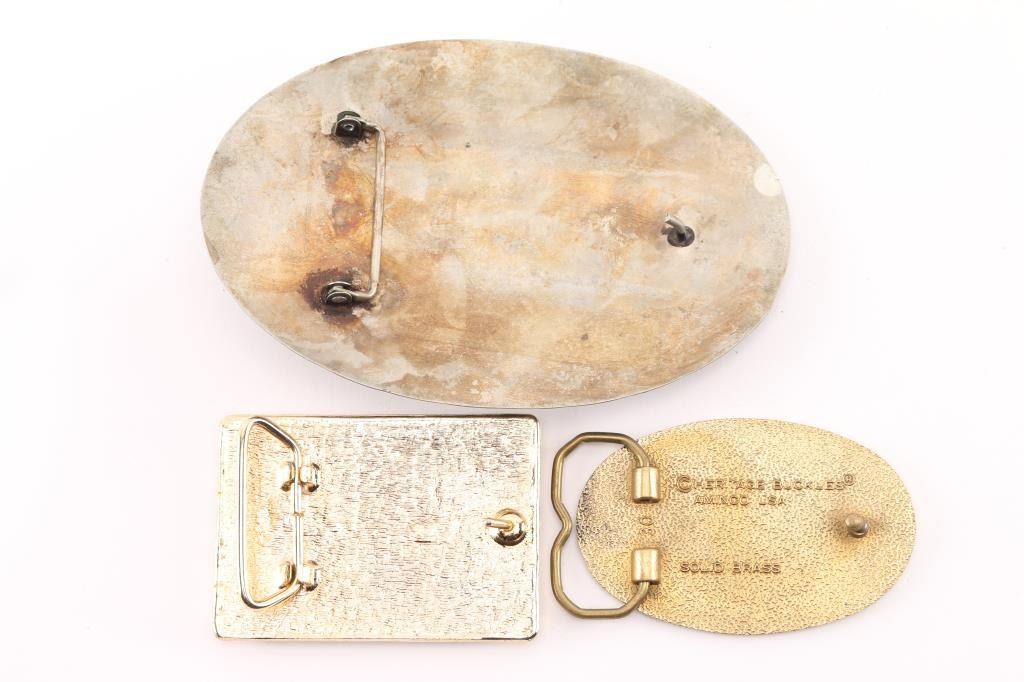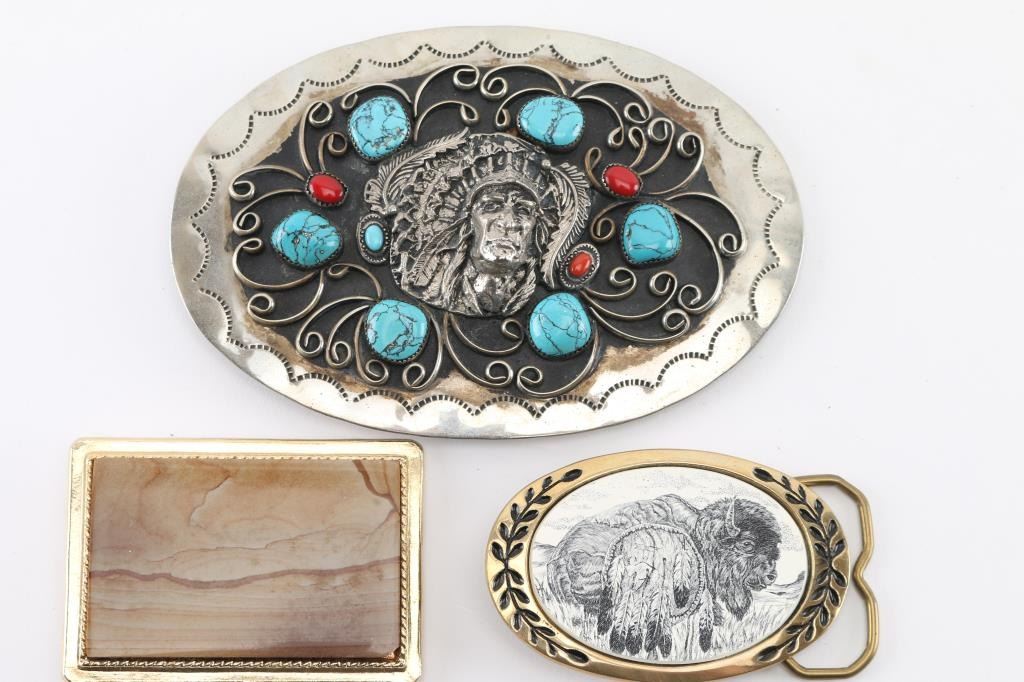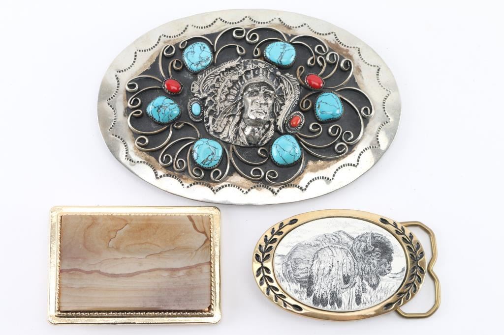 (1) Very Large buckle with indian chief in center surrounded by faux turquoise and coral measures 6"x4" (1)Brass Buckle with brown Stone (1)Scrimshawed Buckle with Buffalo