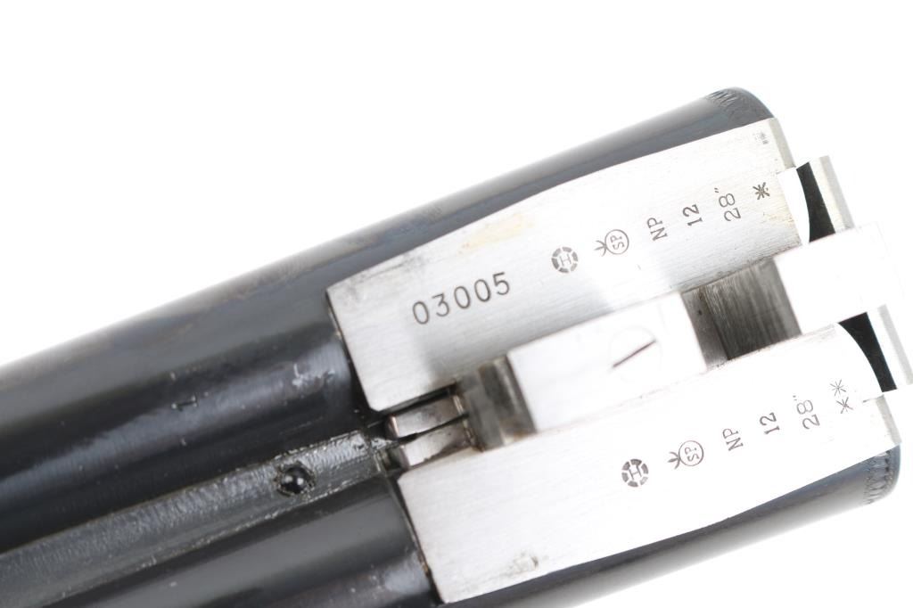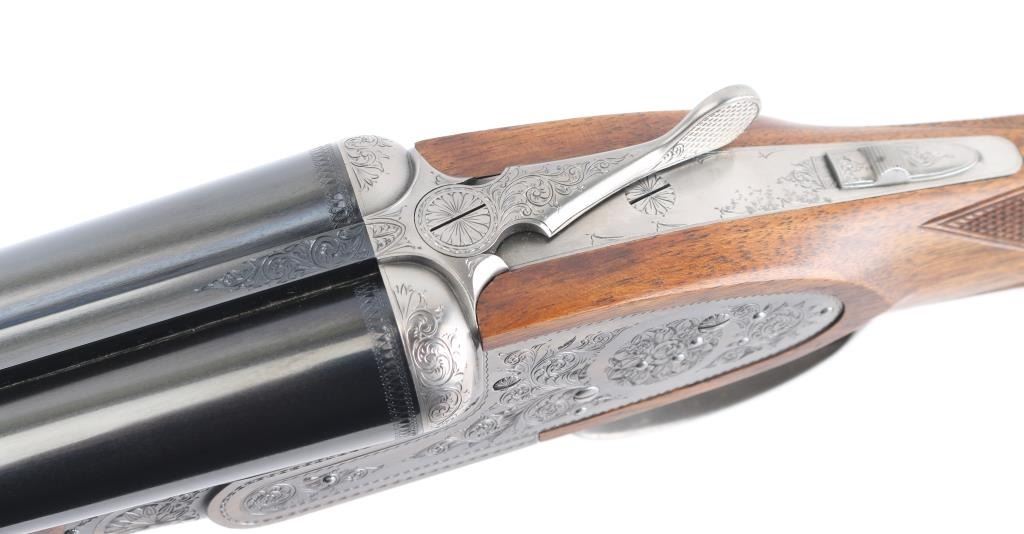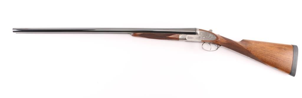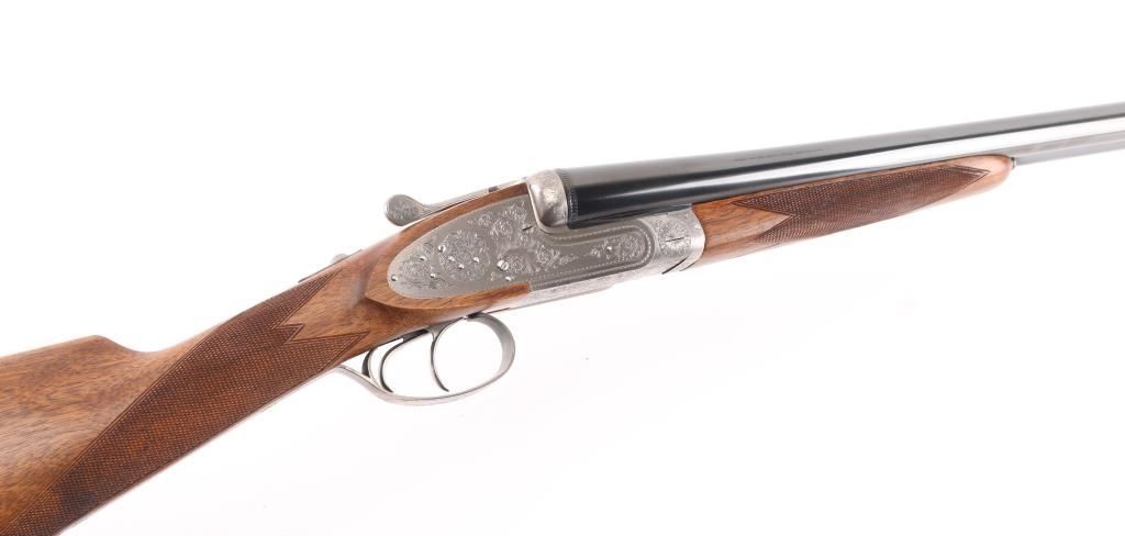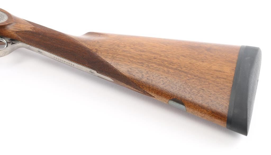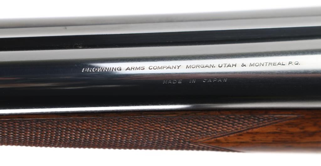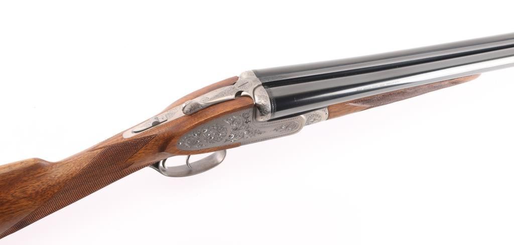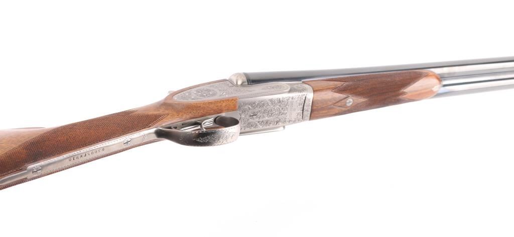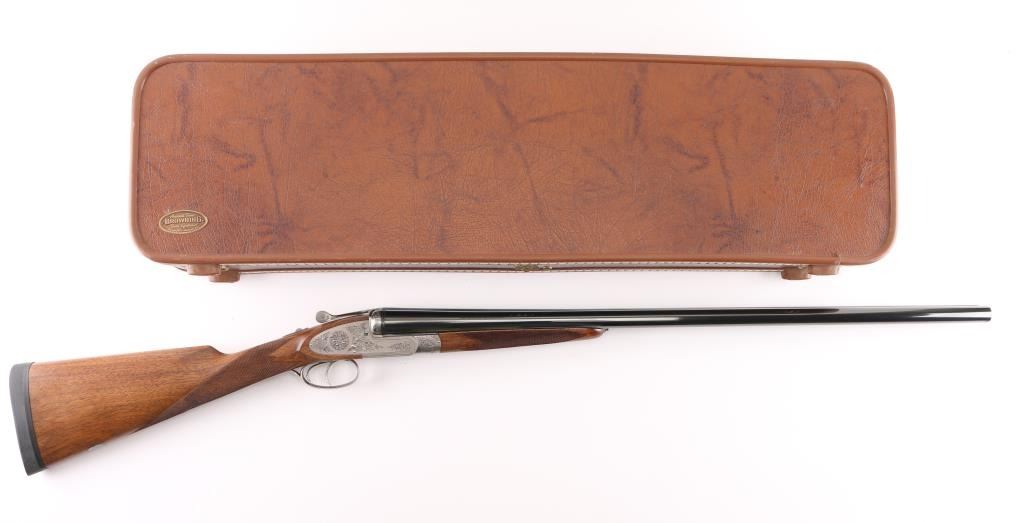 Made in Japan by Miroku circa 1984. Sidelock side-by-side top break shotgun chambered in 12 Ga. for 2 3/4" shells. Full and Modified fixed chokes, ejectors, 28" polished blue finish barrels with brass bead front sight and enhanced engraving on the back of the barrels and top rib, gray receiver with enhanced engraving throughout. High quality wood English-style straight stock with black textured rubber Decelerator recoil pad, checkered fore-end and wrist. LOP 14 5/16". Bore, finish and wood are excellent and pristine. Matching serial numbers on receiver, barrel and forearm. Comes with cushioned brown case. Condition is NRA Excellent. Modern Firearm.