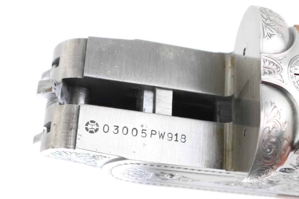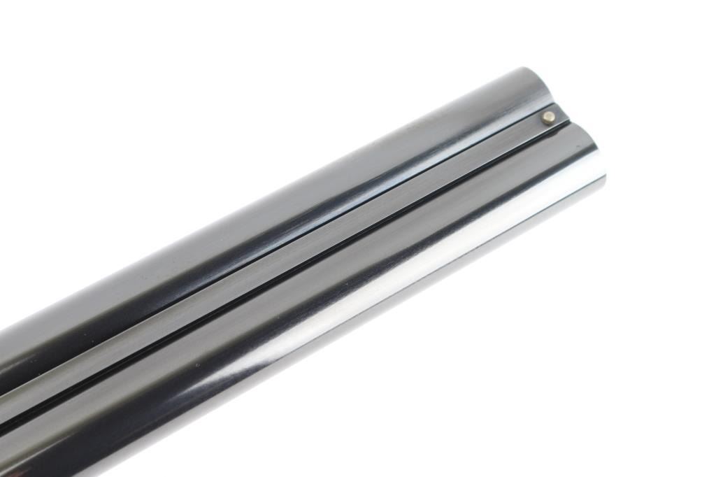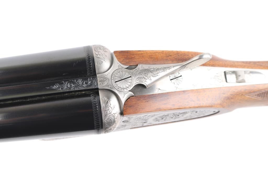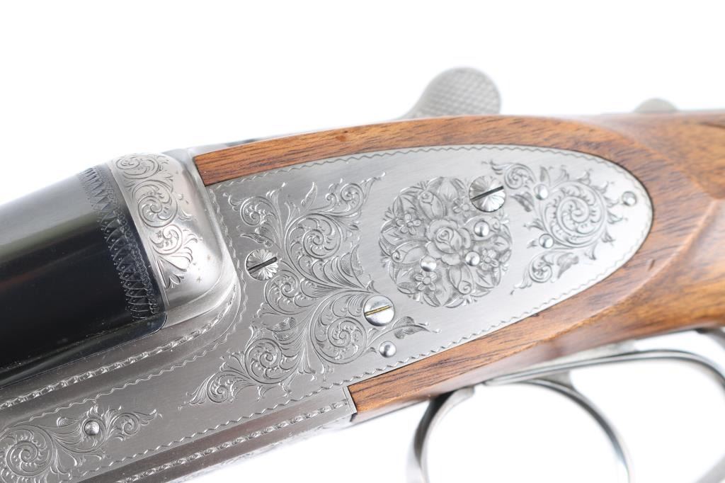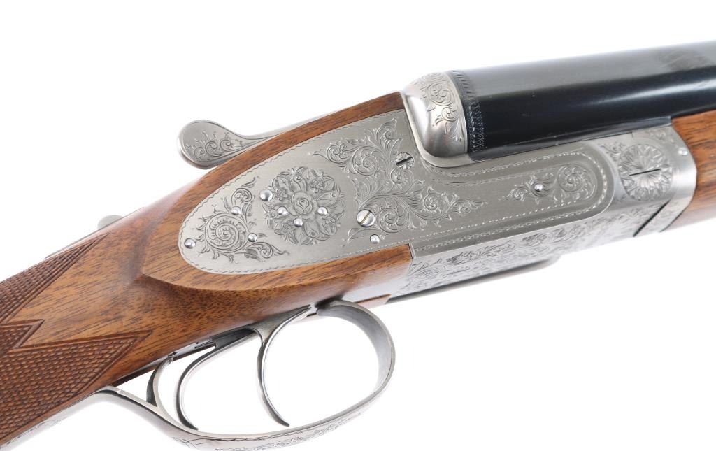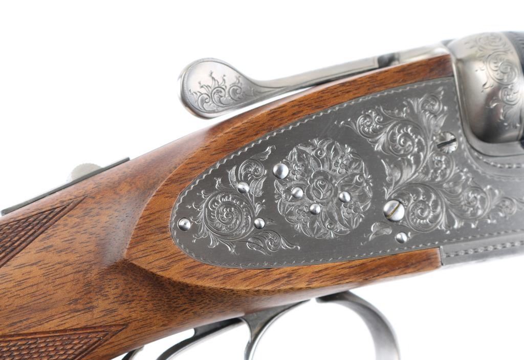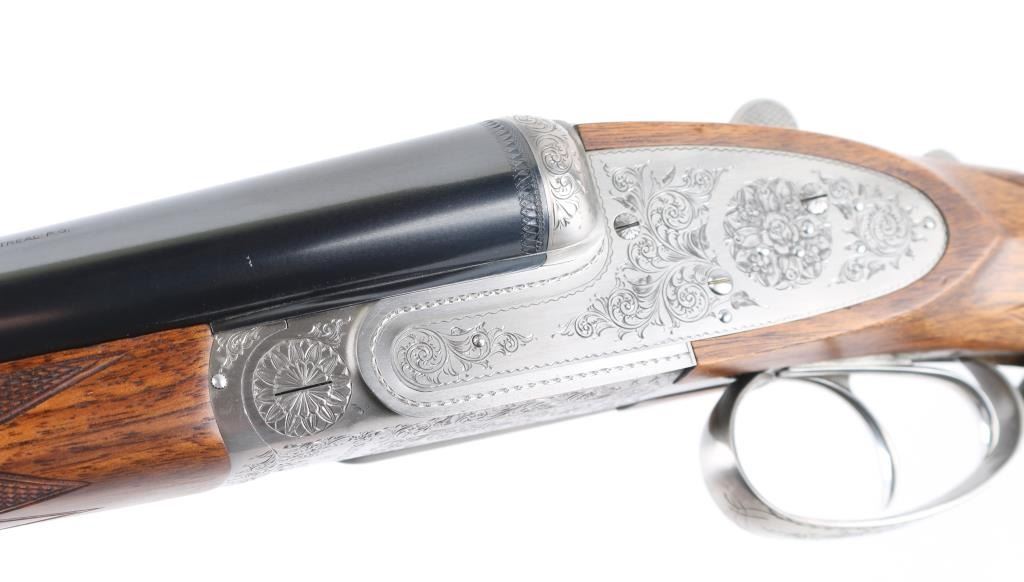 Made in Japan by Miroku circa 1984. Sidelock side-by-side top break shotgun chambered in 12 Ga. for 2 3/4" shells. Full and Modified fixed chokes, ejectors, 28" polished blue finish barrels with brass bead front sight and enhanced engraving on the back of the barrels and top rib, gray receiver with enhanced engraving throughout. High quality wood English-style straight stock with black textured rubber Decelerator recoil pad, checkered fore-end and wrist. LOP 14 5/16". Bore, finish and wood are excellent and pristine. Matching serial numbers on receiver, barrel and forearm. Comes with cushioned brown case. Condition is NRA Excellent. Modern Firearm.
