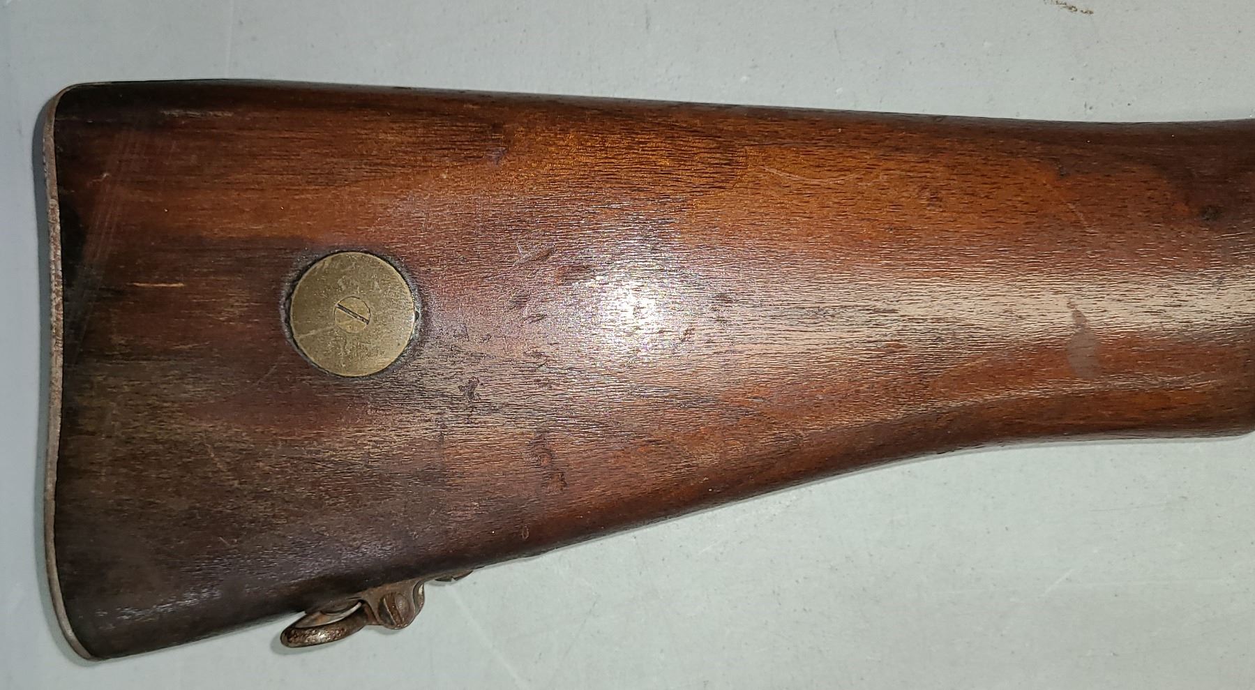 Metal surfaces are a smoky blue/gray patina. The original full wood stock has been
