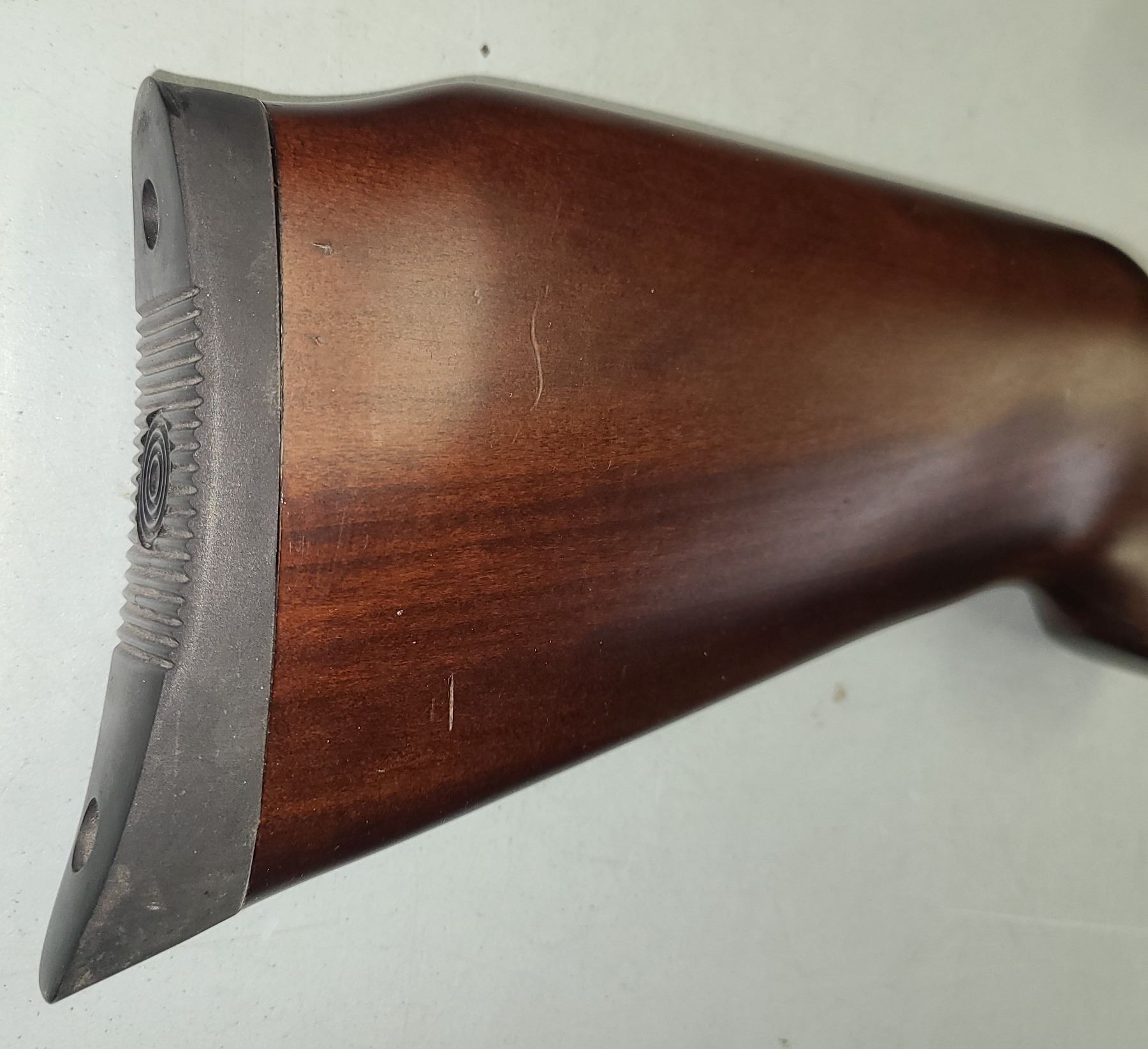 The wood is stained dark reddish-brown A black rubber buttpad is ribbed on the end