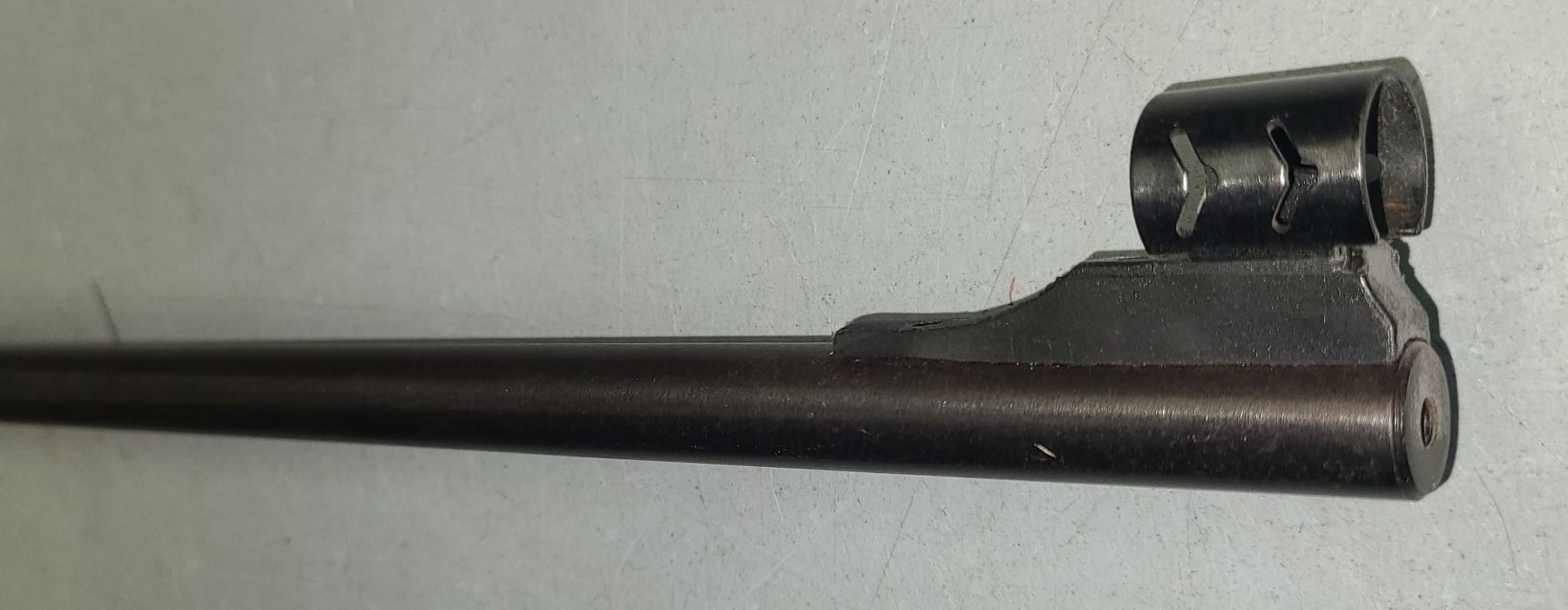 The sights are a hooded post on a ramp in front and a square rear notch with click