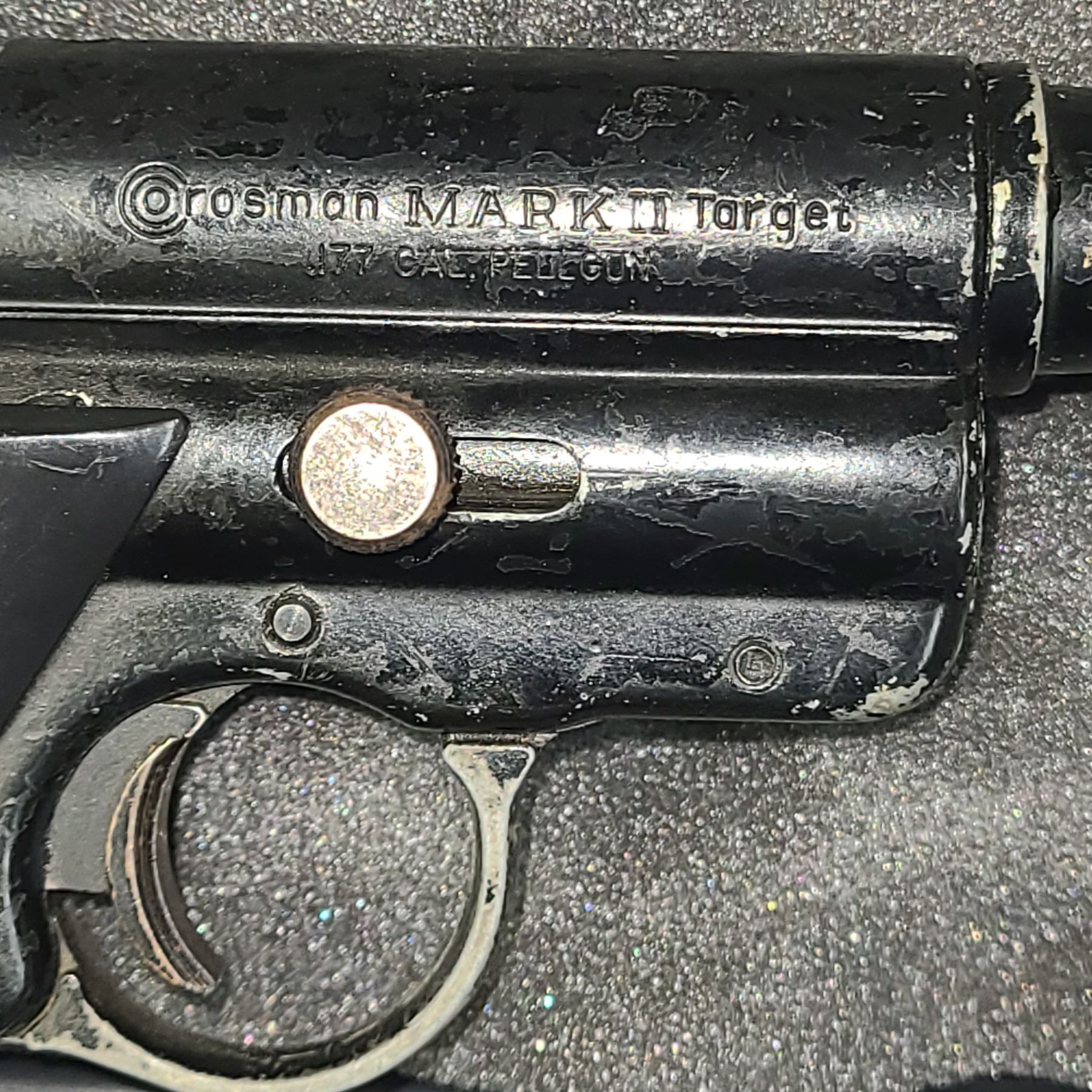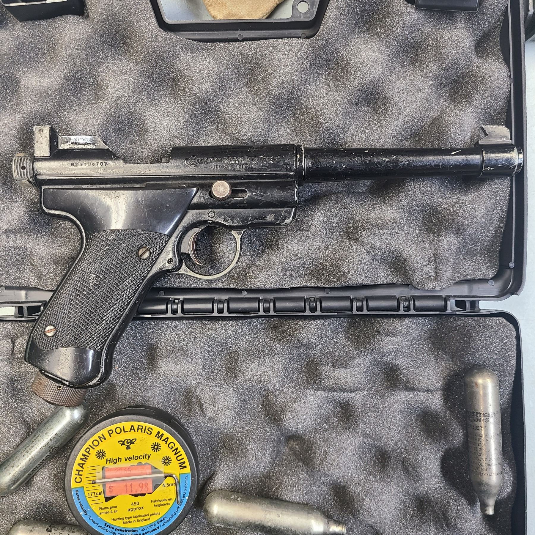 The Crosman Mark II pistol is a .177 caliber single shot Co2 air pistol that was made