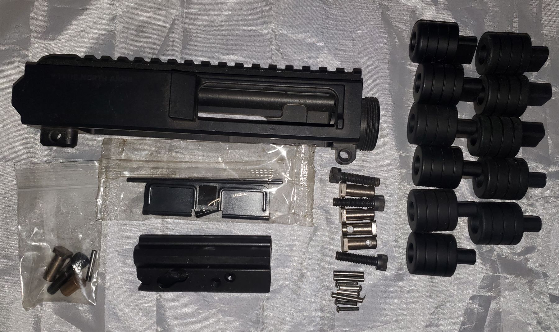 Includes an assortment of Wk parts including pins, charging handles, brass bushing, carrier and a prototype TNA enhanced upper. Intended as a spare parts kit for gunsmiths.