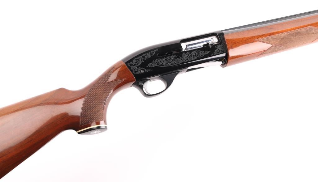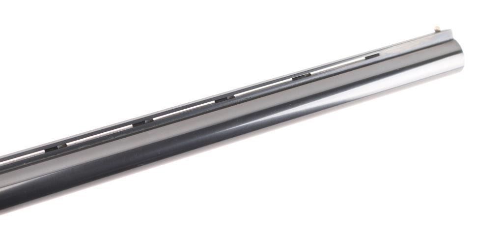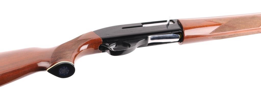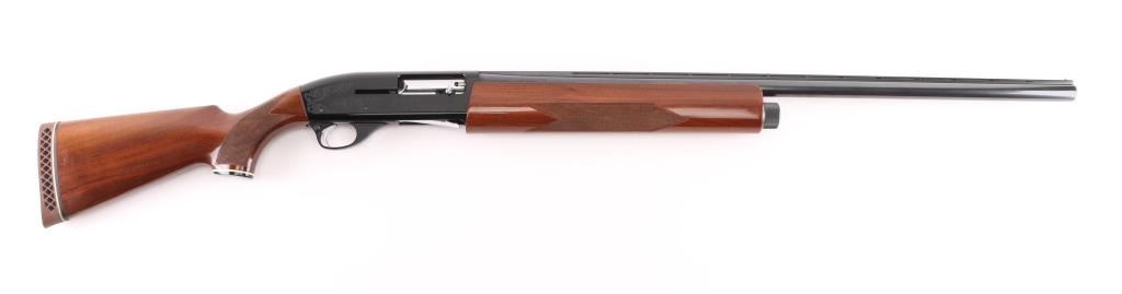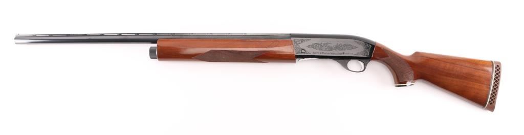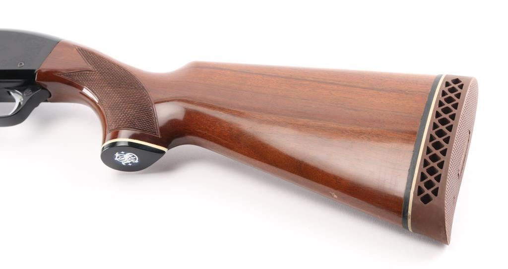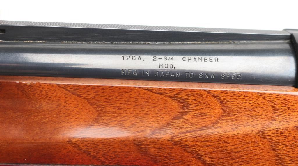 Made in Japan (by Howa?) to Smith & Wesson Specs. this is a gas-operated auto-loading shotgun, chambered for 2.75-inch, 12 gauge shotshells. It has an aluminum-alloy receiver and trigger guard with black anodizing, The receiver has nice scroll work engraved on both sides. The 28" blued barrels are chrome-molybdenum steel, with a vent rib. There is a silver bead front sight and a silver mid-bead as well. The stocks are American walnut with a high gloss finish and cut checkering at the wrist and on the forearm. It has a S&W logo grip cap but the original S&W butt plate has been replaced with a "White Line" recoil pad. The metal finish looks very good with a tiny loss of finish in the # 2 and #4 in the serial number. Bore looks like new and the choke is stamped Modified on the barrel. LOP is 13.5". Wood stocks look very good overall but there are a few scuffs, here and there and one ding on the bottom of the butt stock that broke through the finish but otherwise the gun really looks great. LOP 13 7/16" Condition is NRA Very Good. *Modern Firearm*