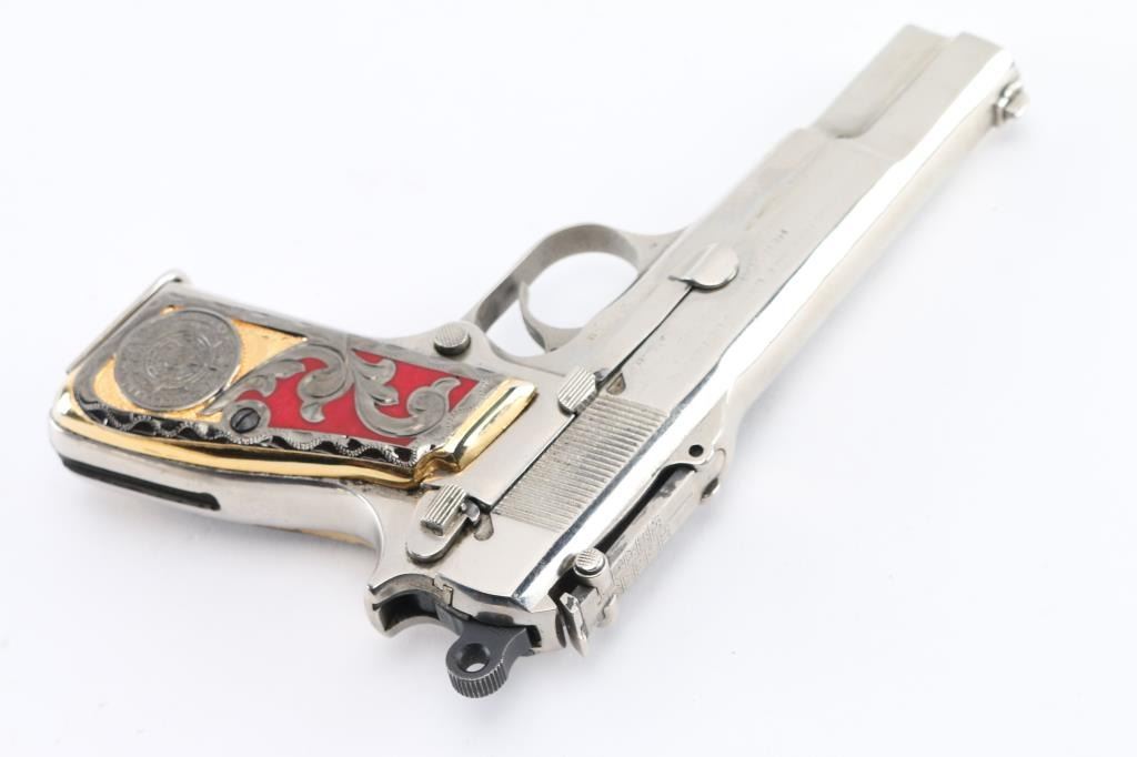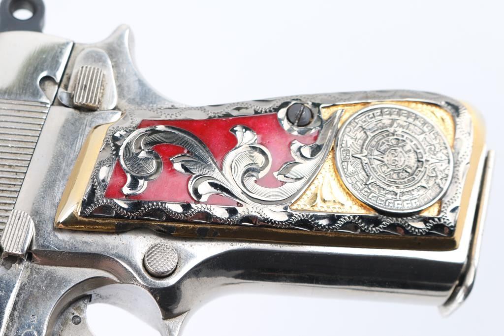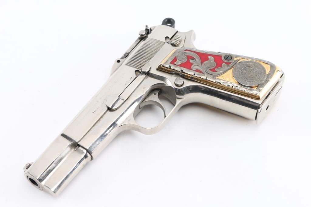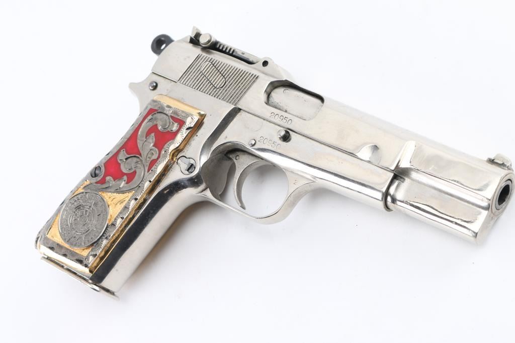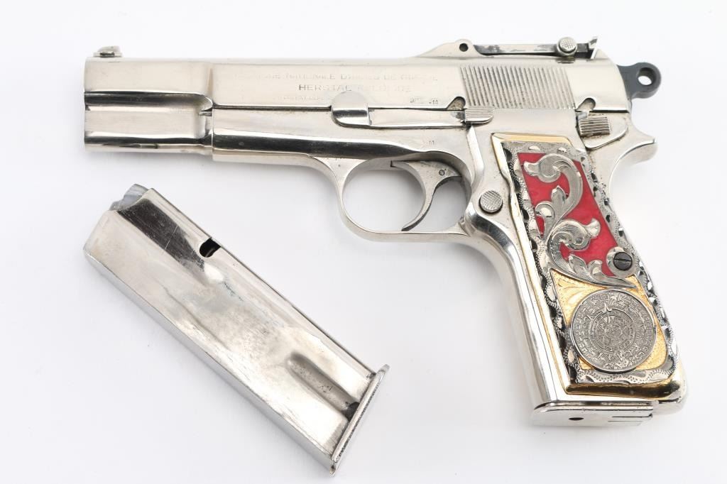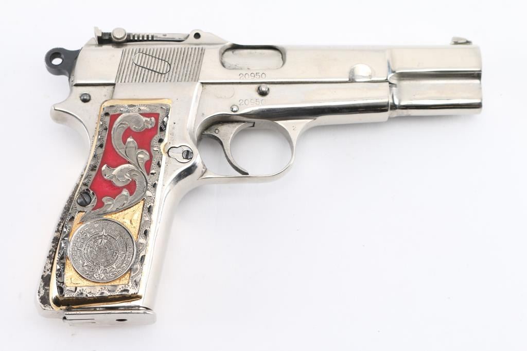'Pre War Tangent & Slotted' Belgian semiautomatic pistol, manufactured circa 1936-1940. Features nickel re-finish, aftermarket fancy gold & red Aztec calendar grips, 4.75" barrel, single action trigger, dovetailed blade front sight, tangent rear sight adjustable to 500m, frame mounted safety, push button magazine release. Numbers match on slide & frame. Markings are eroded from heavy cleaning & buffing, proofs and address lines can be barely read. Bore is good condition, strong rifling, frosted. The metal shows blemishes and loss of original contours under the new finish, with the nickel showing bright and even. Grips are good condition overall, a bit loose. Includes (2) nickeled magazines. Condition is NRA Very Good (as heavily modified) *** C&R Firearm ***