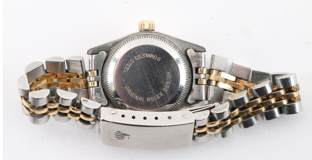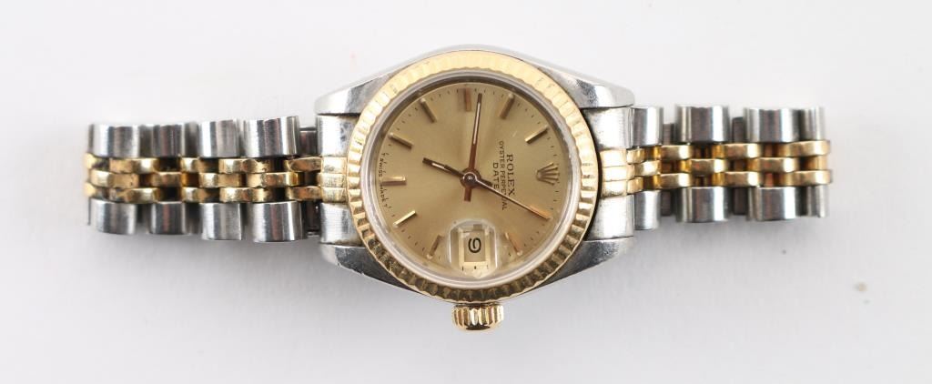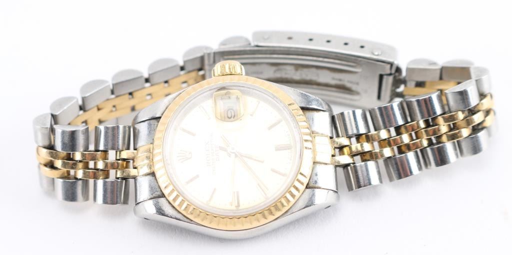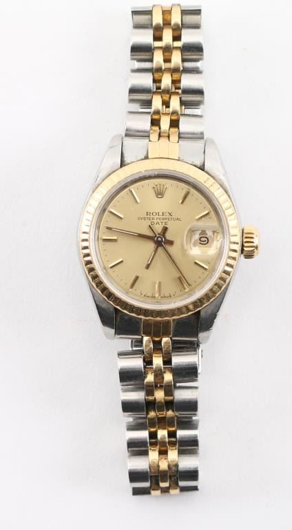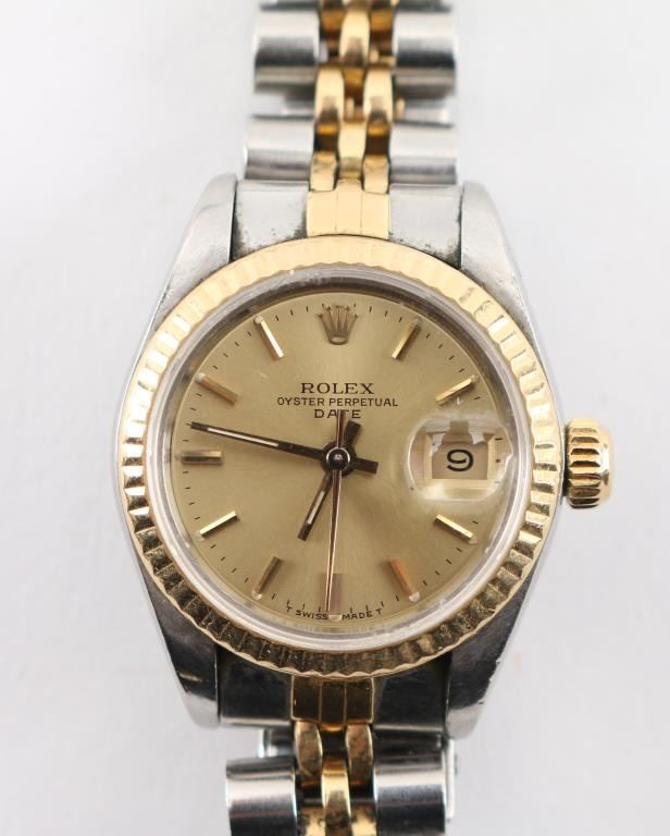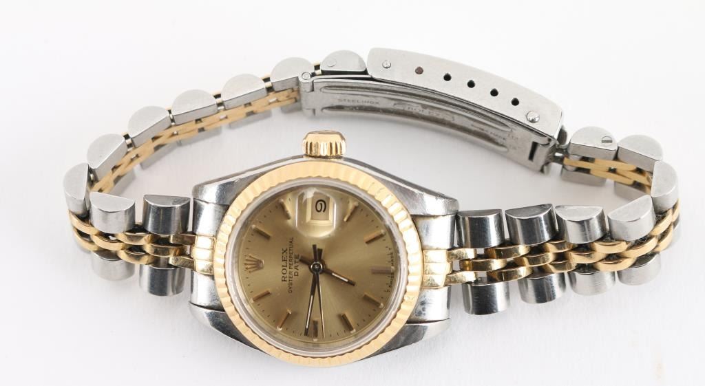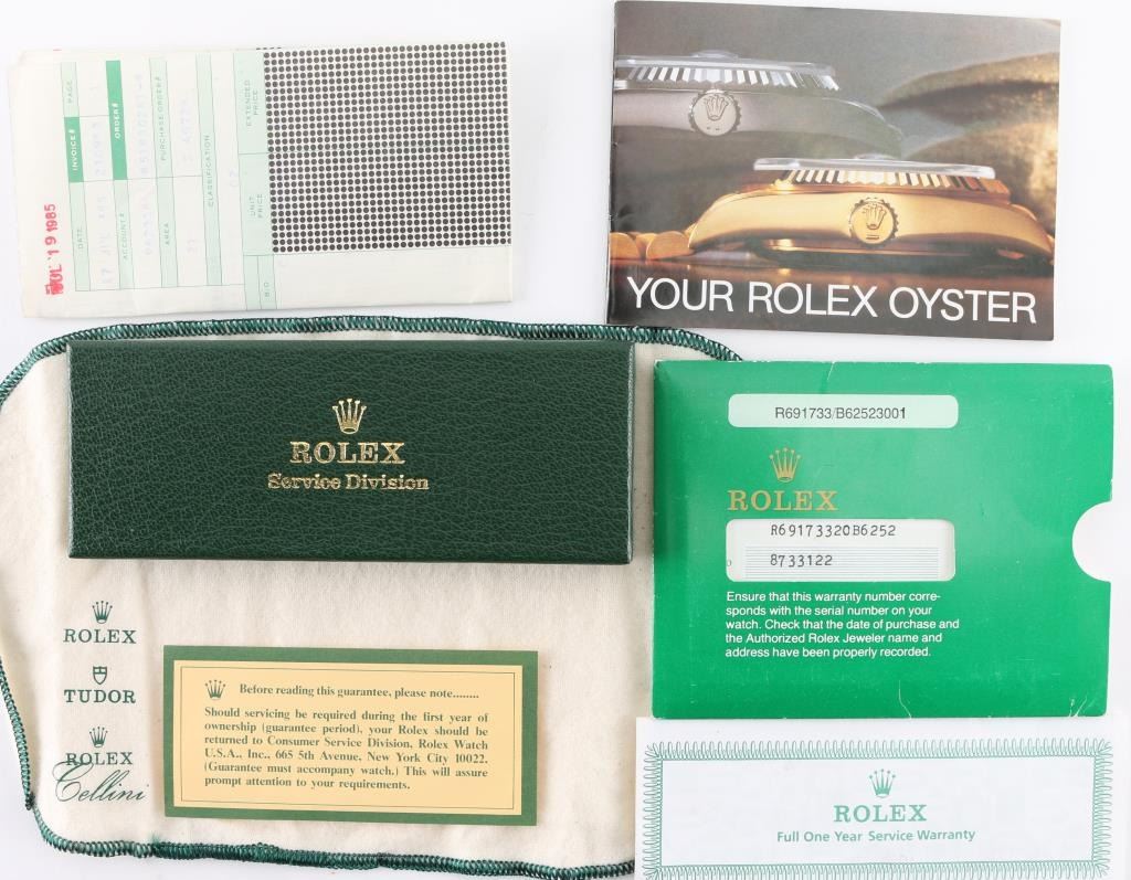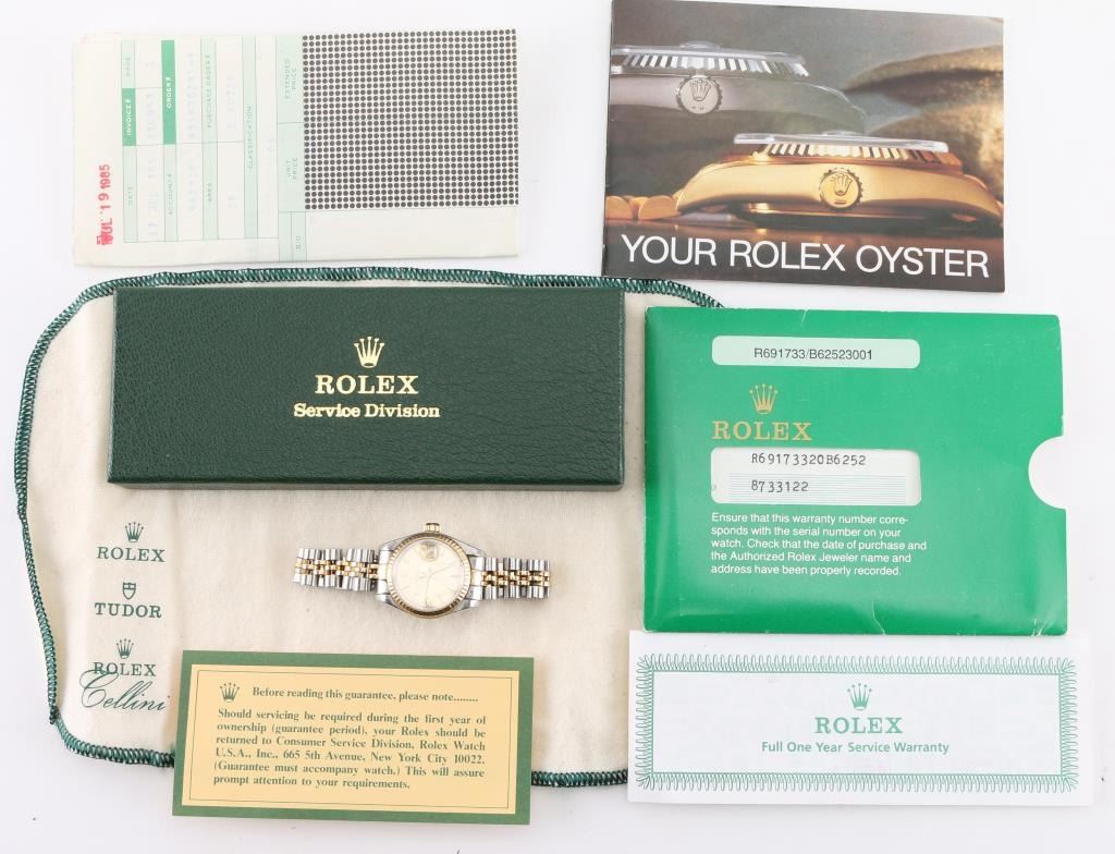 Date Adjust, Two-tone stainless with 18Kt Yellow gold. Includes original receipt, warranty, and box. In working order needs to be tuned and cleaned. Watch serial number 8733122. Purchase July 19,1985. Estimated fair market value 8000.00