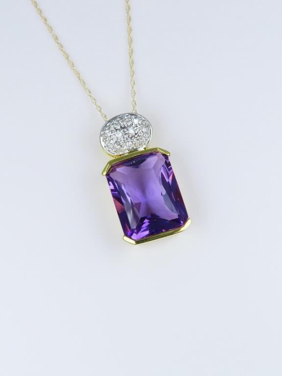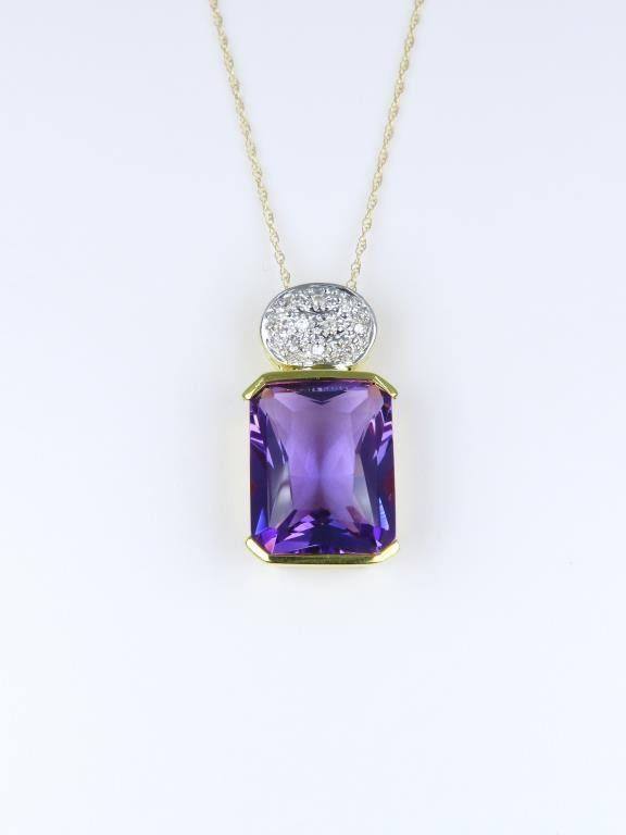 Amethyst and Diamond Pendant featuring radiant cut Amethyst accented with 10 pave set round cut Diamonds crafted in two tone 18 karat gold.