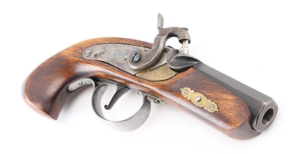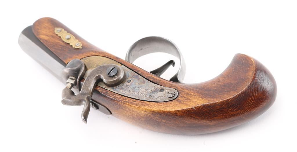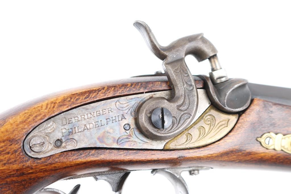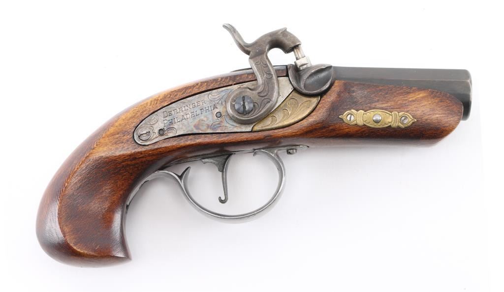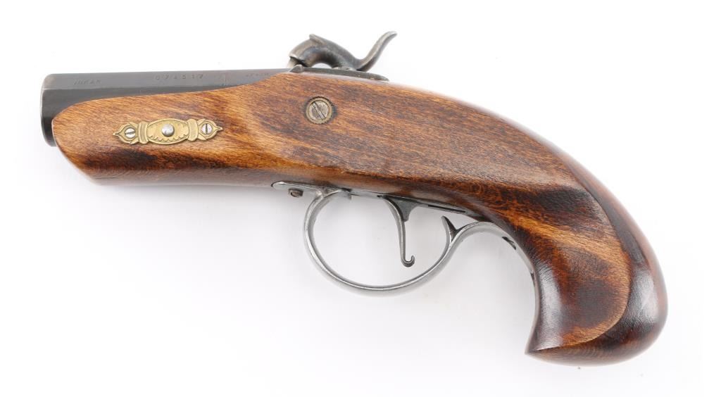 Derringer, Single-shot. percussion. Spanish made blackpowder derringer in the style of the Philadelphia Derringer. (The gun that killed President Lincoln) 3" octagonal barrel. Case color lock plate One-piece wood stock, with brass fittings. Blued barrel is dull/faded. Bore appears good, but dusty. Two-cock hammer action is tight. NRA Condition-Very Good. Antique Firearm.